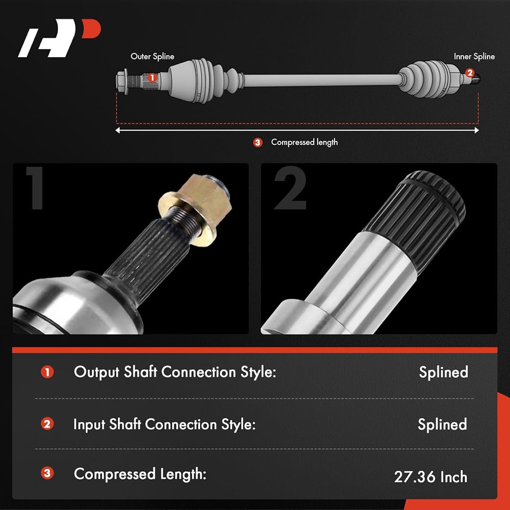 [Specifications]: ① Location: Front Left (Driver Side); ② ABS Ring Included: No; ③ Axle Nut Included: Yes; ④ Compressed Length: 27.36 inch; ⑤ Input Shaft Spline Count: 24