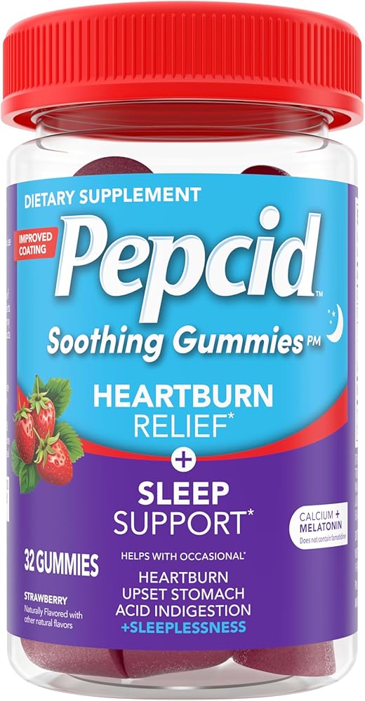 Help relieve occasional heartburn, upset stomach, acid indigestion, & stress* with Pepcid Soothing Gummies, Heartburn Relief* + Stress Relief* dietary supplements. The gummies are formulated with key ingredients including 500 milligrams of tricalcium phosphate to help relieve occasional heartburn, upset stomach & acid indigestion, & 40 milligrams of lemon balm extract to help relieve occasional stress*. The heartburn gummies formulated without famotidine have a pleasant peach-raspberry taste & are naturally flavored with other natural flavors. Suitable for relief of occasional heartburn* for individuals 12 years & older—take two gummies & chew thoroughly before swallowing. Keep Pepcid Soothing Gummies on hand or in a purse or backpack for on-the-go relief. Made in Canada with domestic & imported ingredients. *These statements have not been evaluated by the Food & Drug Administration. This product is not intended to diagnose, treat, cure, or prevent any disease.