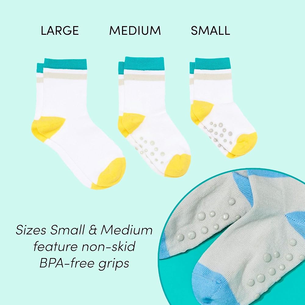 • PATTERNED CREW SOCKS - Offer safety & comfort with non-skid BPA-free grips, seamless toes, and soft, breathable organic cotton. Fun, patterned socks with color-coded heels & toes promote independence, while tag-free size labels prevent mismatches