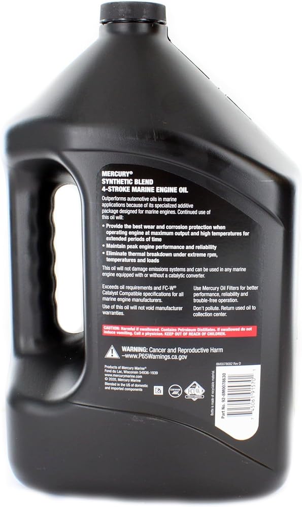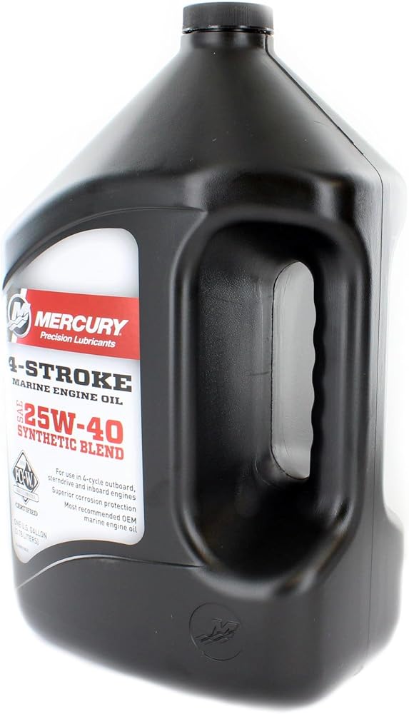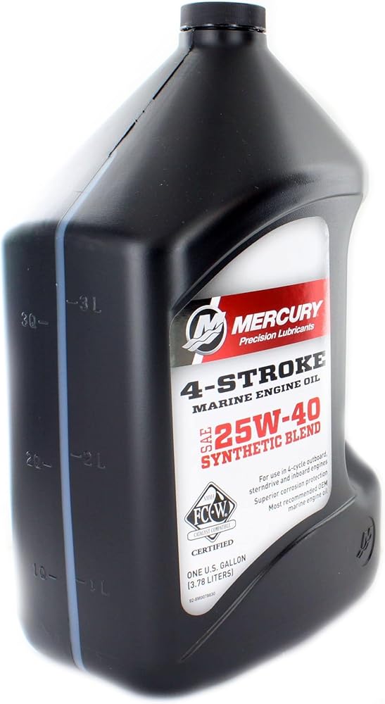 A technology-specific 25W-40 marine oil formulated for the world's first and only supercharged and intercooled outboard engine. The unmatched torque and acceleration of this engine requires maximum protection found in this well-balanced combination of today's highest quality synthetic and mineral base stocks. Verado Oil meets the stringent marine operational requirements of all Mercury's 4- and 6-cylinder Verado models. First-in-class for all FC-W durability test properties, with industry-leading internal marine engine corrosion protection. Here are the results from a comparison test between Verado Oil and a popular 15W-50 full synthetic oil. Verado oil shows significantly better shear stability and volatility, and is higher in viscosity and High Temperature High Shear (HTHS) after shear. The popular competitive formulation uses a fair amount of VM (viscosity modifier) which is subject to shear, while the Mercury oil contains no VM. As a result, the Mercury oil will hold its viscosity far better in difficult situations. The HTHS after shear follows along with the viscosity stability, which results in improved bearing protection. Use of the full synthetic competitive oil resulted in higher oil consumption than the Mercury 25W-40.