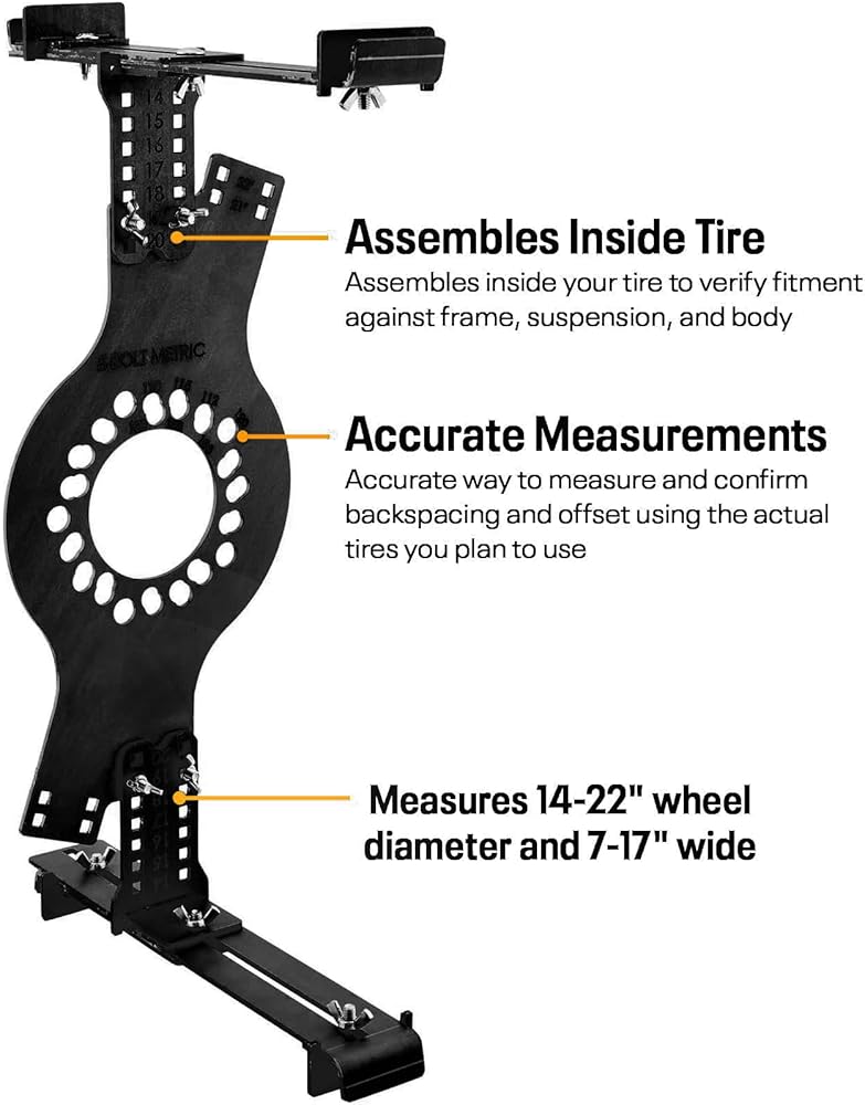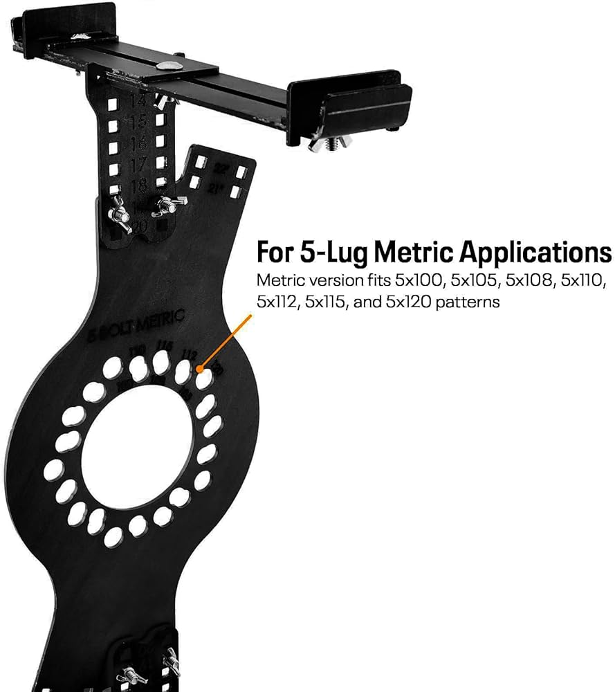 The tool comes complete with 1/4-20 carriage bolts and wing nut hardware to provide quick, tool-free adjustments. The kit includes all the tools needed to measure 14 to 20 inch wheel diameters (7 to 17 inches wide), making it easy to use and suitable for all levels of automotive enthusiasts. The wheel fitment tool supports 5-wheel metric wheel bolt patterns in seven of the most popular fitment patterns including 5x100, 5x105, 5x108, 5x110, 5x112, 5x115, and 5x120 patterns for a wide variety of custom applications.