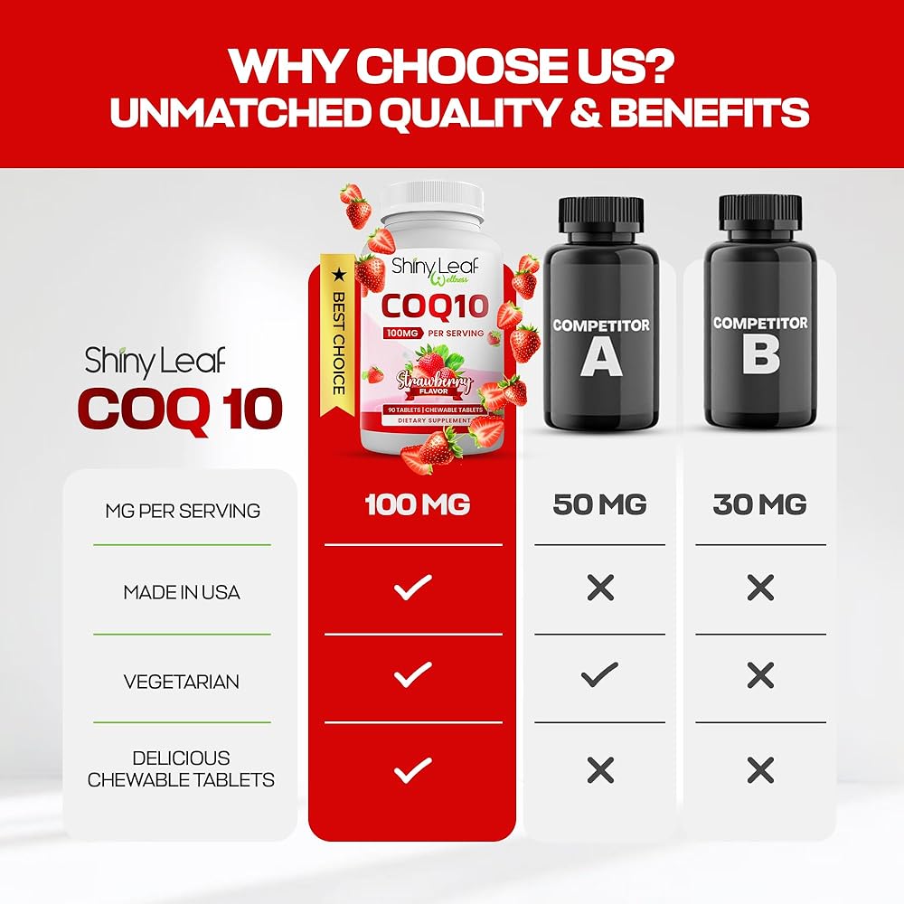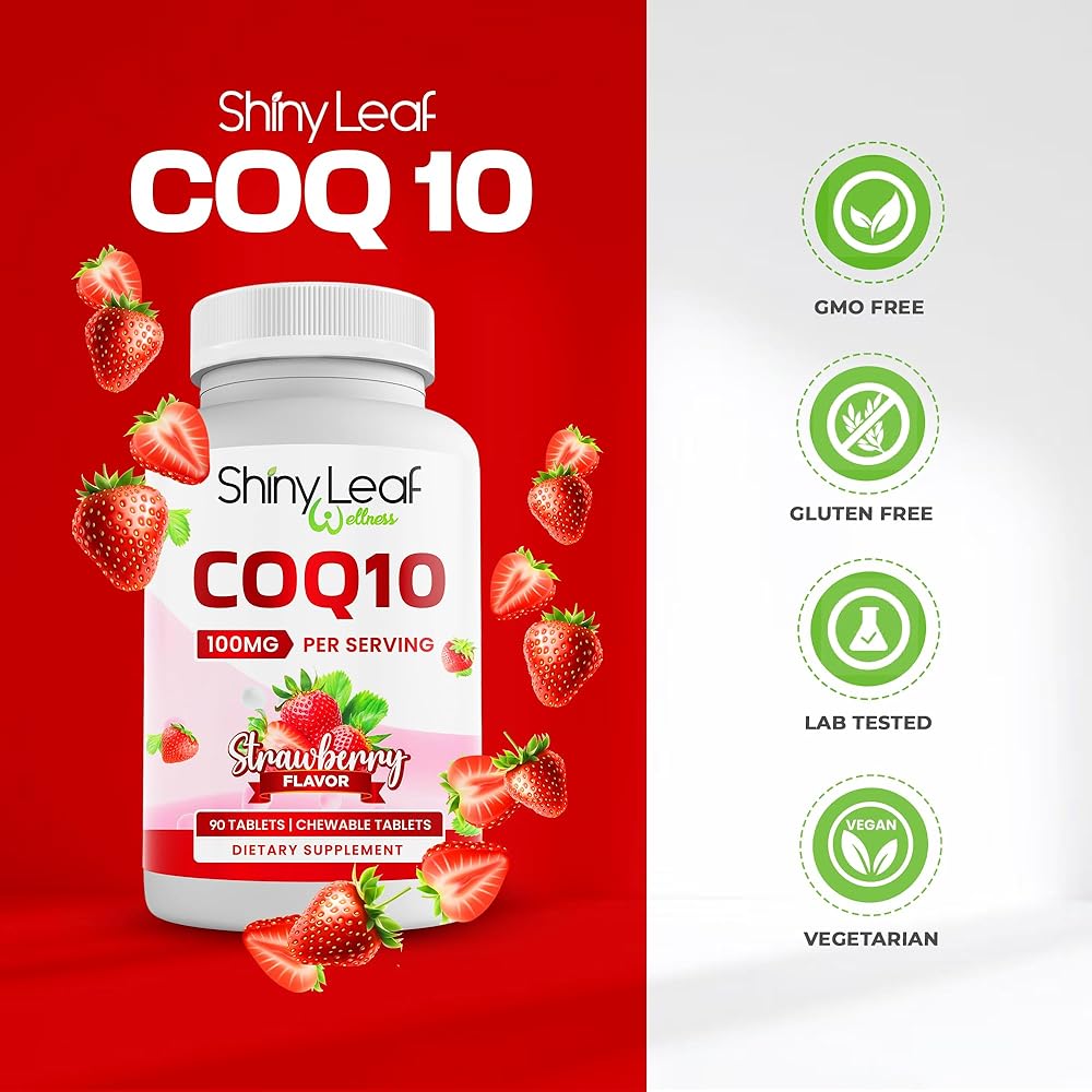 Shiny Leaf CoQ10 100mg - Chewable CoQ10 Supplement - Coenzyme Q10 for Heart Health & Energy - Natural Co Q 10 Supplement for Cardiovascular Wellness - 100mg Chewable Tablets, 90 Tablets, Made in USA