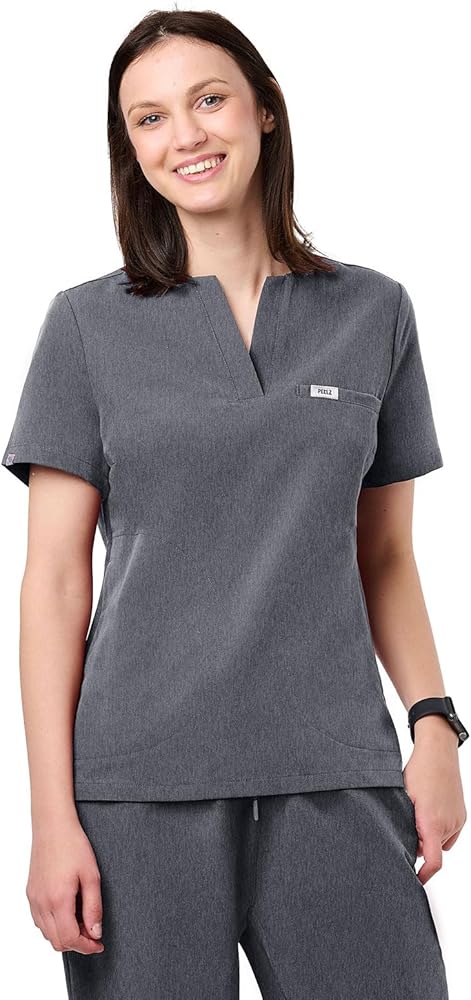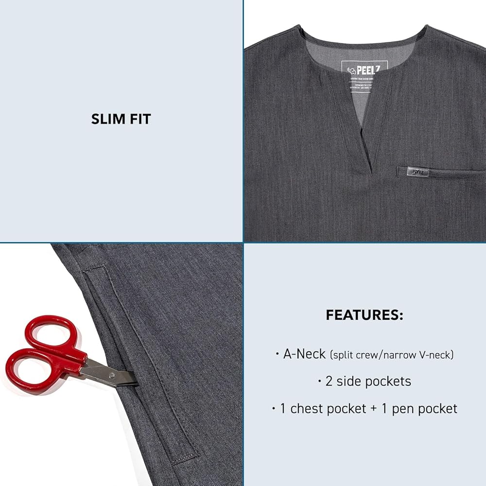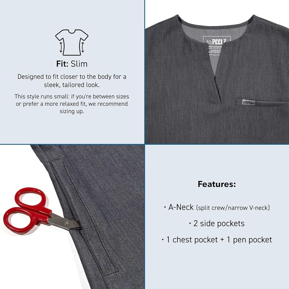Tired of juggling essentials during a hectic shift? Meet the Rina A-Neck 4-Pocket Scrub Top from Peelz Scrubs, designed for healthcare professionals and first responders who want functional scrubs in a different style. Experience the Z Factor benefits of high-quality 4-way stretch fabric, maximum comfort, and a tailored fit for ultimate performance. With its versatile style and functional features, this scrub top offers affordable luxury, ensuring you stay comfortable, confident, and professional all day long. Designed to keep you organized and focused, this scrub top offers a smart pocket design that includes 1 welt pocket, a pen pocket and 2 side besom pockets for your work essentials. This feature allows quick access and efficient operation, making it an excellent choice for those seeking reliable and practical workwear. Whether navigating busy hospital corridors or attending to patients, this scrub top ensures women in healthcare environments are prepared to take on their day with reliability and ease. Designed with premium 4-way stretch fabric, this scrub top provides unmatched comfort and flexibility, offering a luxurious feel throughout your demanding day. The breathable fabric wicks away moisture, keeping you dry and comfortable through the busiest days. The short sleeves help keep you comfortable while the machine washable and dryable fabric makes for an easy laundry day. Peelz Scrubs are crafted for long-lasting durability that seamlessly integrate into your routine. Versatile enough to harmonize with any work ensemble, this women's scrub top is a perfect blend of modern style and utility. Whether paired with classic scrub pants or worn casually, this top adapts seamlessly to your style. Elevate your professional attire with the Rina A-Neck 4-Pocket Scrub Top and experience the enhanced blend of comfort and efficient design that makes it a must-have women's scrub tops.