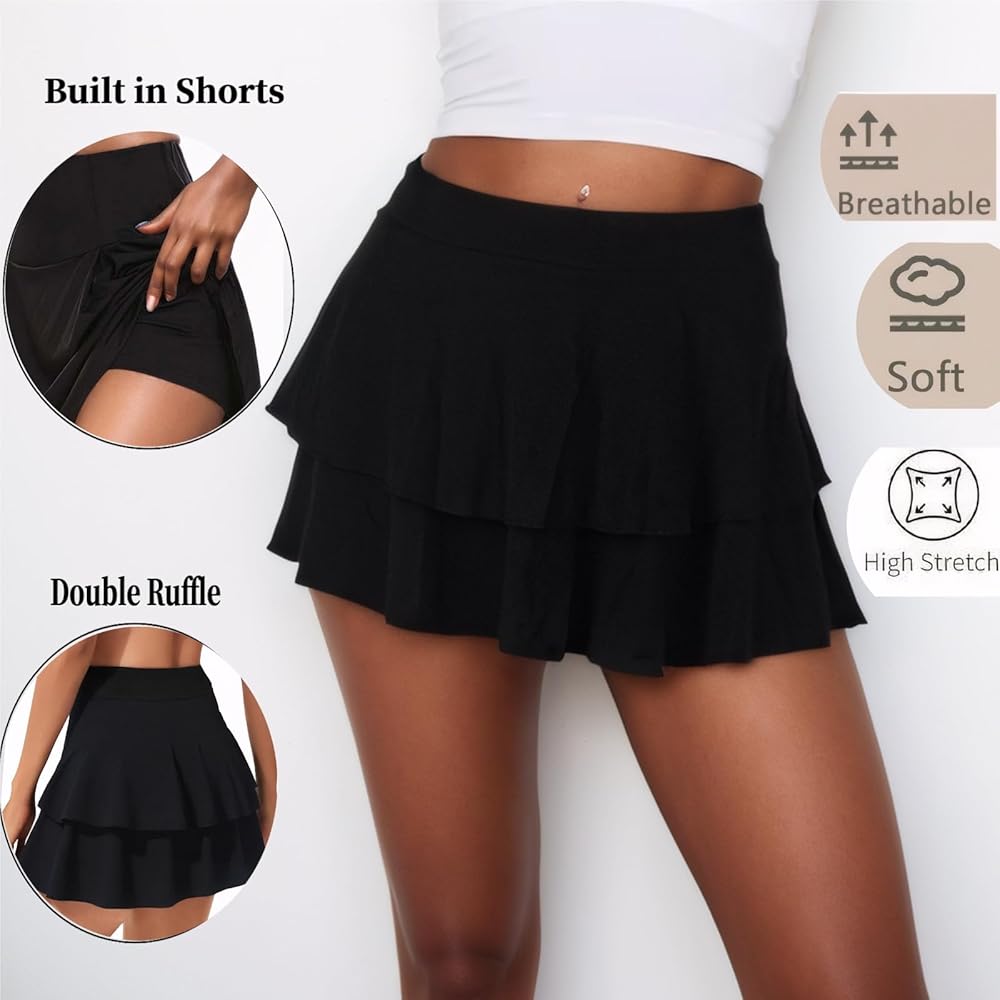 Women‘s Stretch High Waist Bodycon Double Ruffle Mini Skort