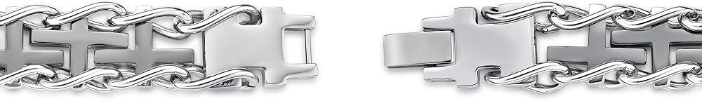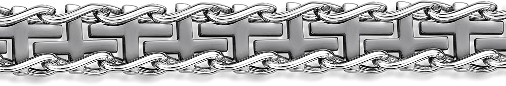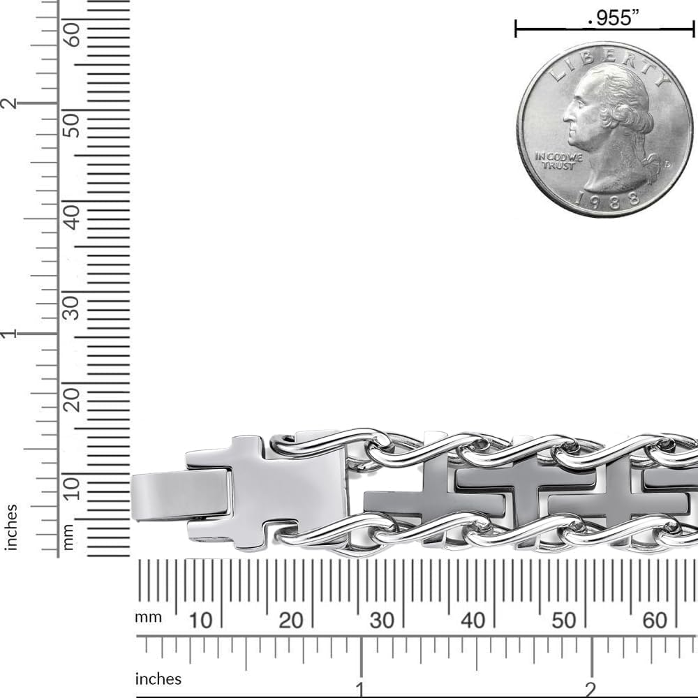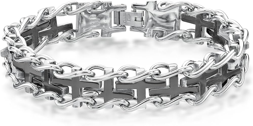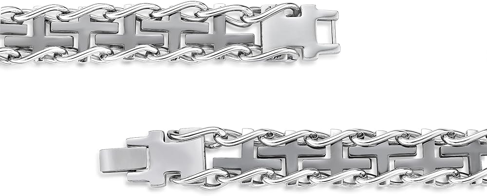 This thick specialty cross bracelet is a great gift for him. Crafted in stainless steel with gold ion plating, the bracelet measures 8.5 inches in length and it is secured with fold over clasp.