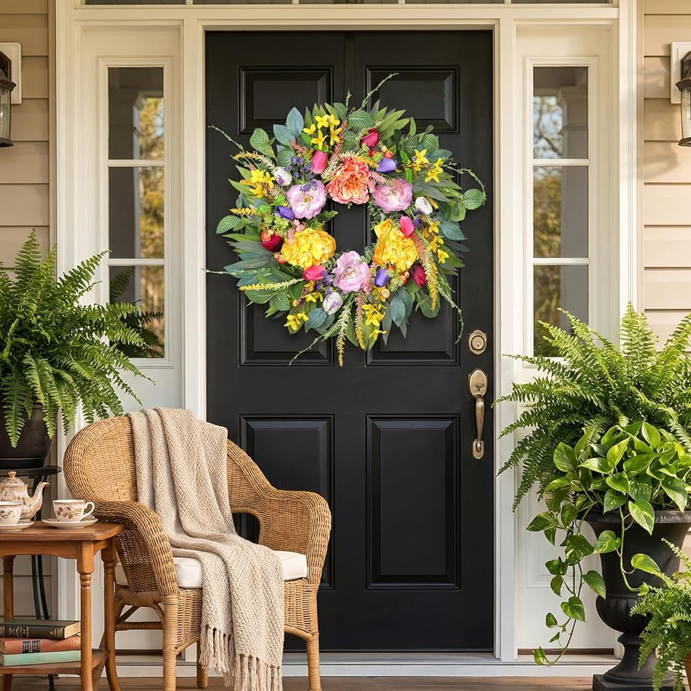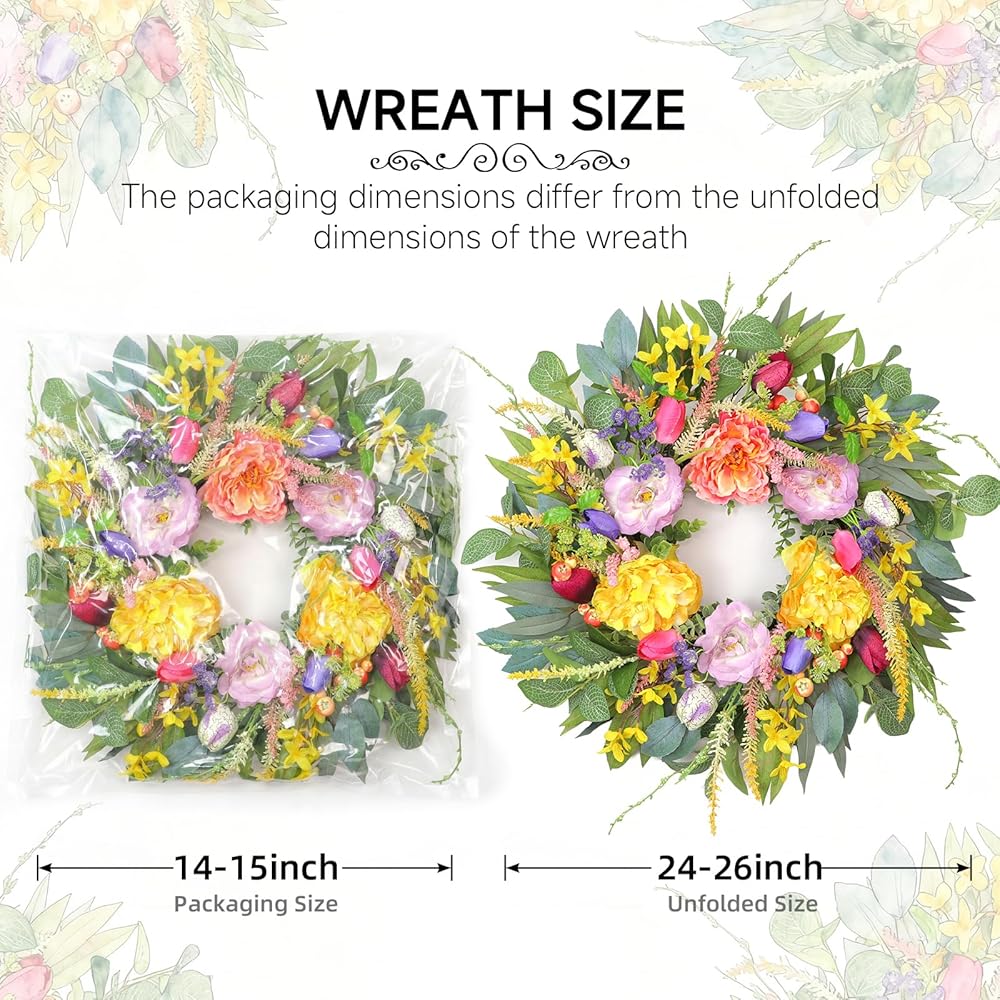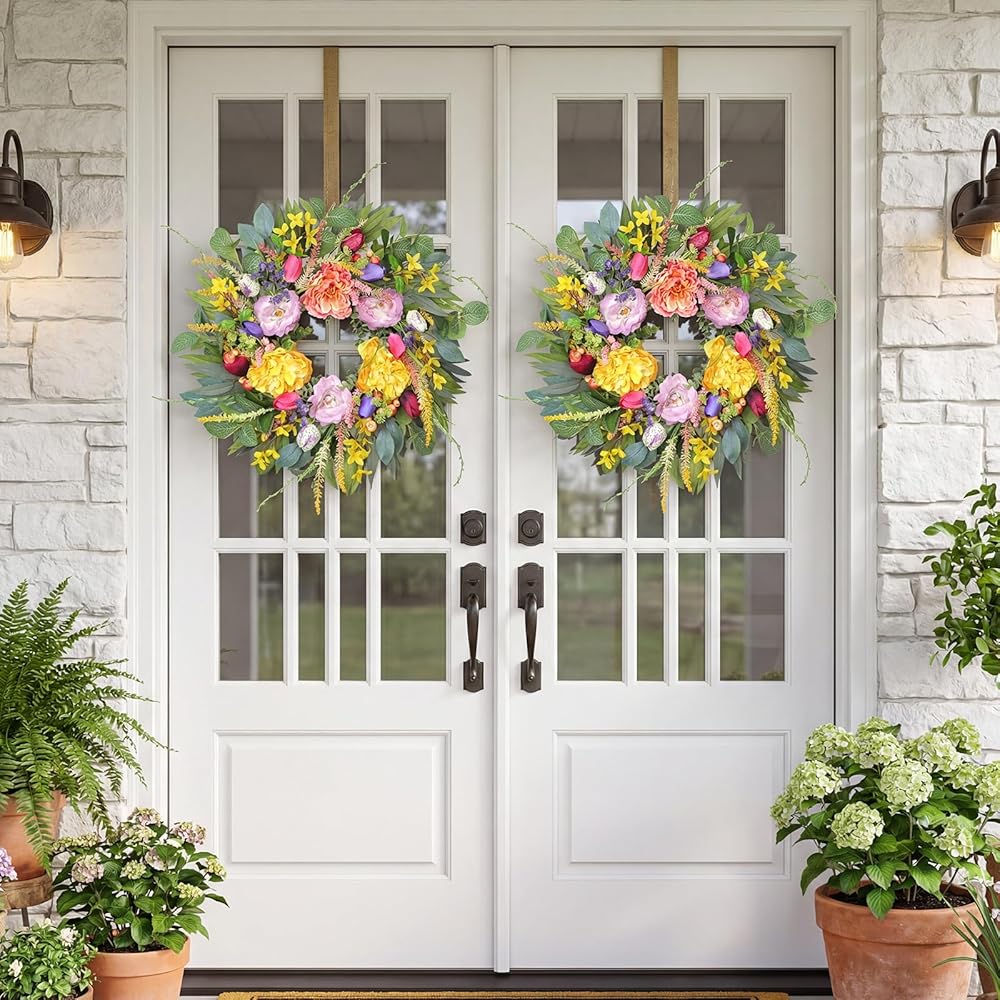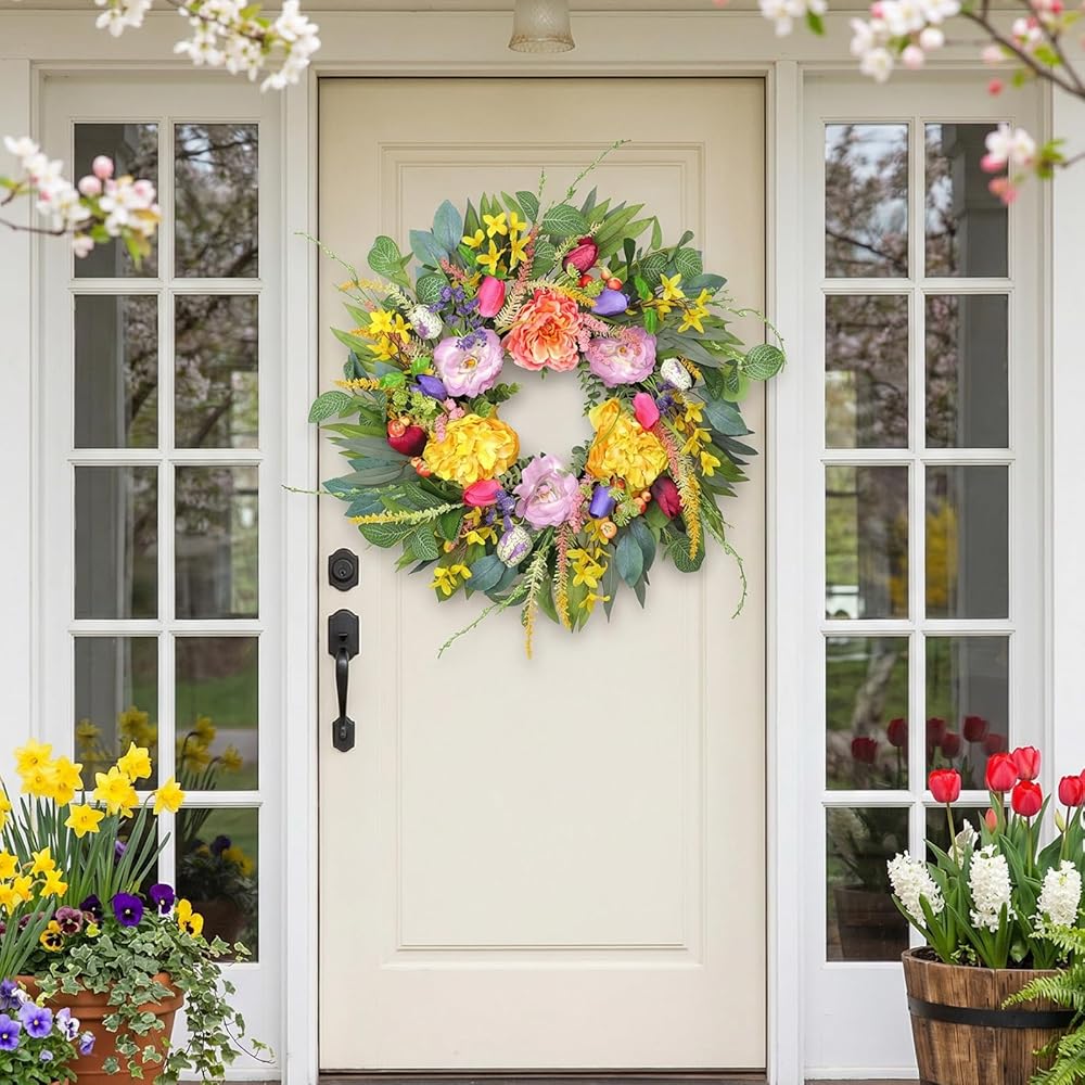 Chrisxiao 24 Inch Spring Wreath for Front Door, Artificial Eucalyptus Wreaths with Peony, Tulip & Eucalyptus Leaves,Summer Wreath for Home Farmhouse, Outdoor, Porch, Wall Window Decor All Year Round