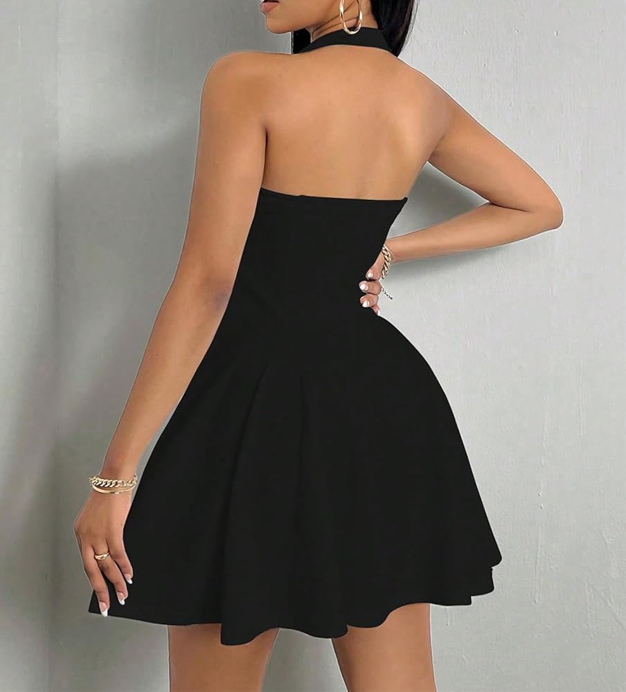 ARTFULLY DESIGNED: Captivate the crowd in our women's Mini Dress, which boasts some unique and engaging details: an alluring halter neck, a flattering a-line flared design, and a hip-length style