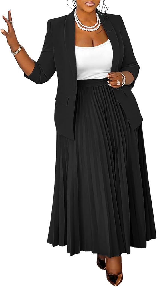 Features: Plus size 2 piece blazer skirts suit, long sleeve open front blazer jacket, high waisted pleated maxi skirts, solid color, 2 piece skirt suit set for women plus size, elegant women blazer skirts set, women office business suit set, blazer outfits for fall
