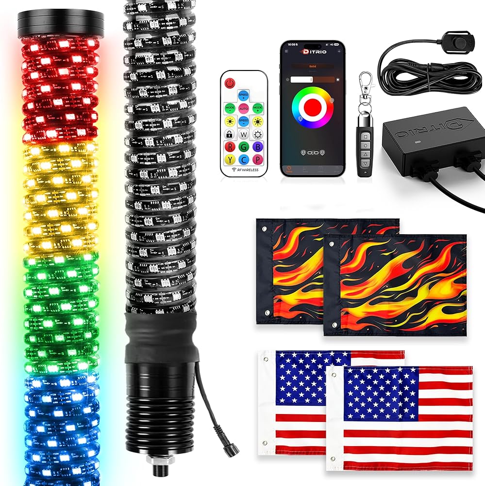 【Spiral RGBW Chasing Whip Lights】DITRIO led whip lights with thousands of colors and dancing patterns, brightness, and speed settings.With a more tightly coiled design, ensure glow in 360°direction delivers high bright color. Improve your safety on the night trail and always stand out on the ride