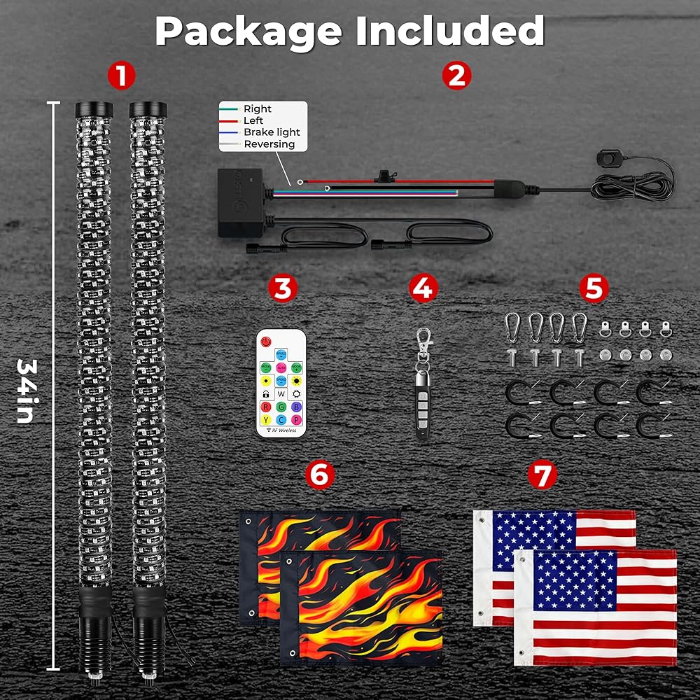 【Enhanced Safety Turn Signal】Our utv whip lights come with synchronized left and right steering, reverse, and brake warning functions to enhance driving safety. And our app includes integrated signals with 7 vibrant turn signal colors and 3 sleek brake light modes,you can diy your turn signal color