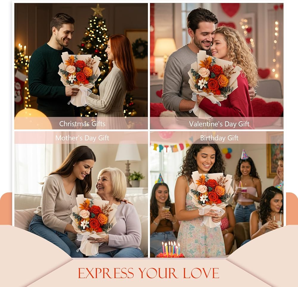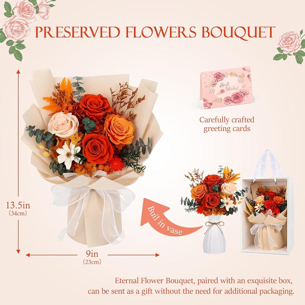 Flowers for Delivery Prime Preserved Flowers Bouquet That Last 3-5 Years Real Forever Roses Bouquet for Girlfriend Mom Mother Women Wife Anniversary Birthday Valentines Day Gifts for Her,Orange