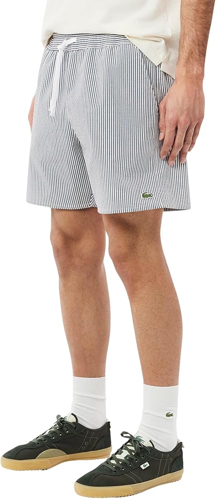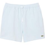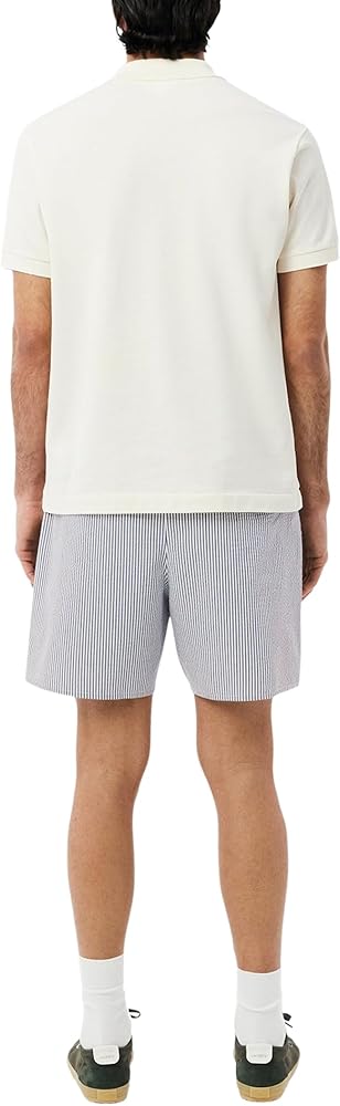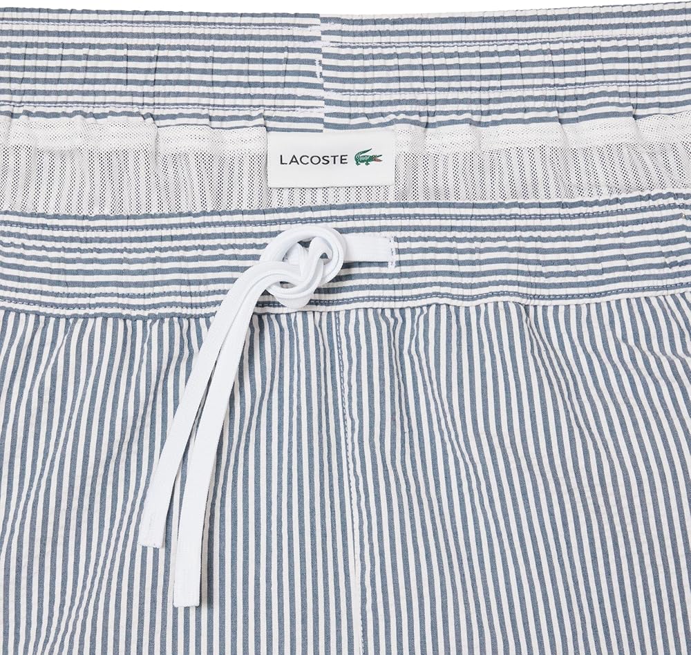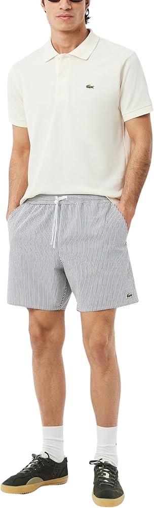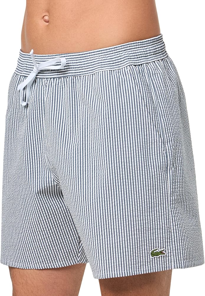 The essential swimwear of Lacoste wardrobe. Full elasticated waistband swimwear, middle length swim, just above knee when worn. Timeless swimwear of Lacoste essentials with sustainable approach thanks to recycled fabric. Endowed with a full elasticated waistband adjustable with drawcord and an integrated mesh boxer to ensure freedom and ease of movement in all circumstances. Presents a deep color range offer matching the iconic polo L1212 for the perfect look at the beach or the idal summer combo near the pool.