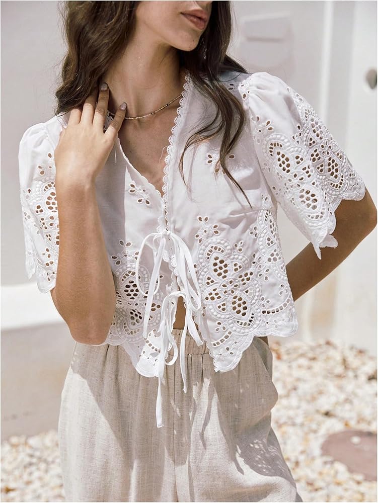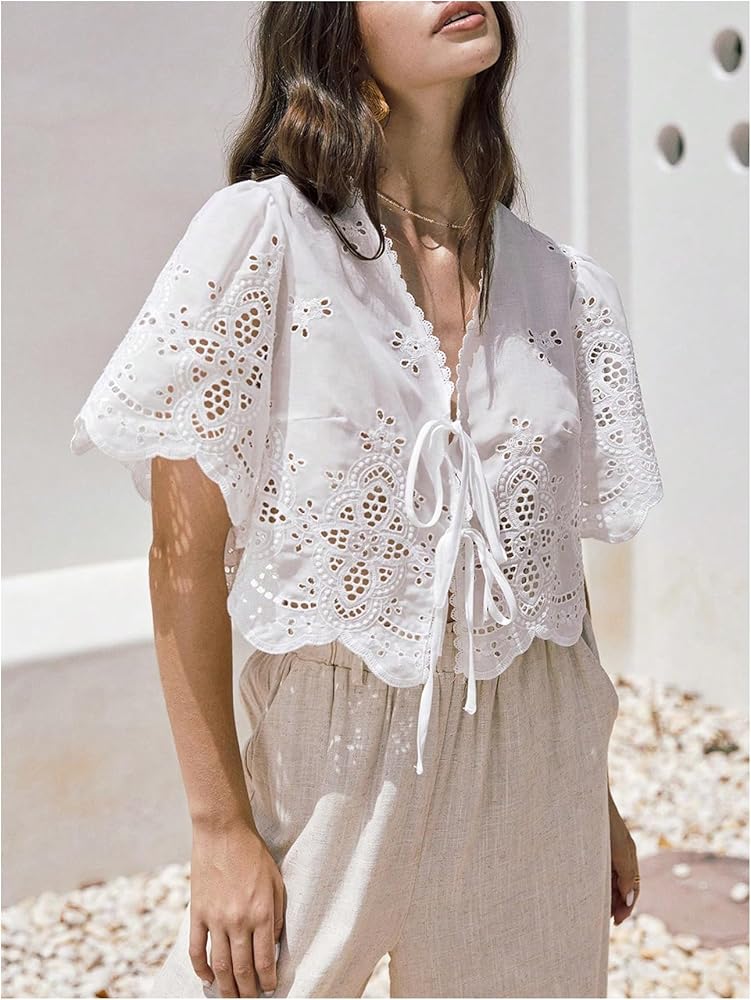 - Feature: Summer crop tops for women, eyelet embroidery, v neck, short sleeve, loose fit, making you look casual and trendy