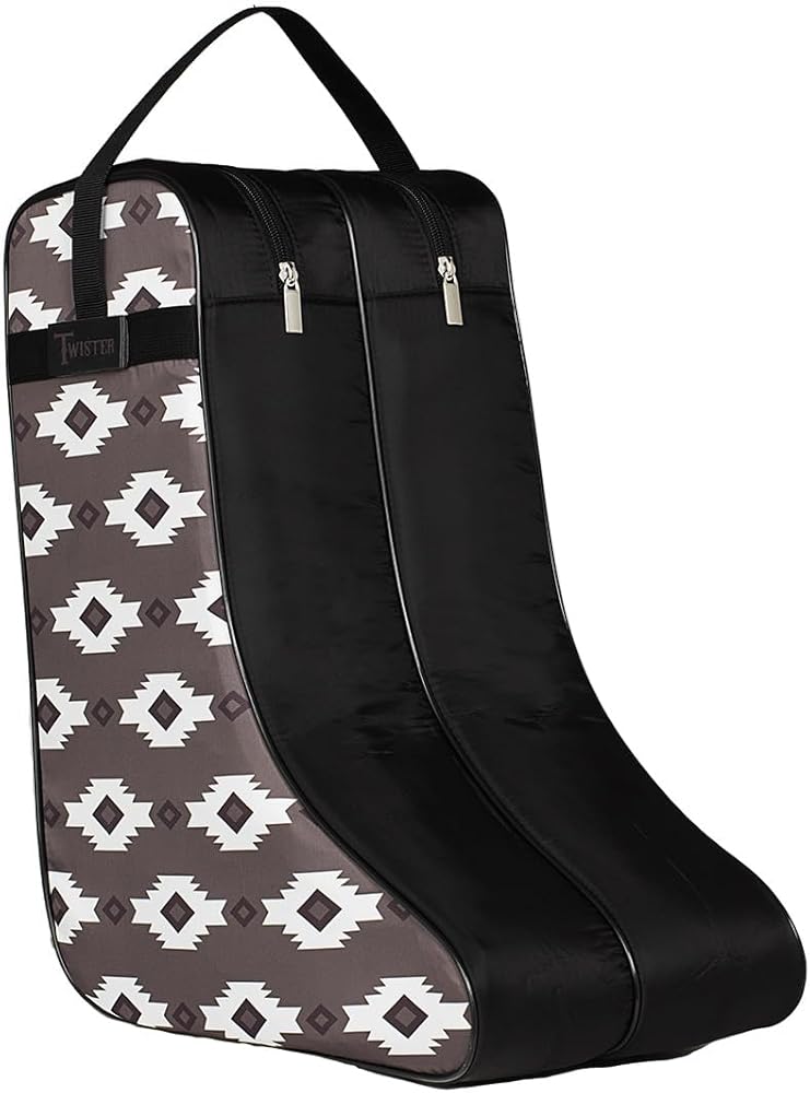 Twister Boot Bag: Protect your boots in this quality Twister boot bag by M&F Western Products. Chocolate brown nylon handles and microsuede gussets with chocolate brown piping accent. Side panels in black, tan, brown and blue southwest arrow pattern. It closes with double zippers. 50% Polyester, 40% PU, 10% PVC. 0411747