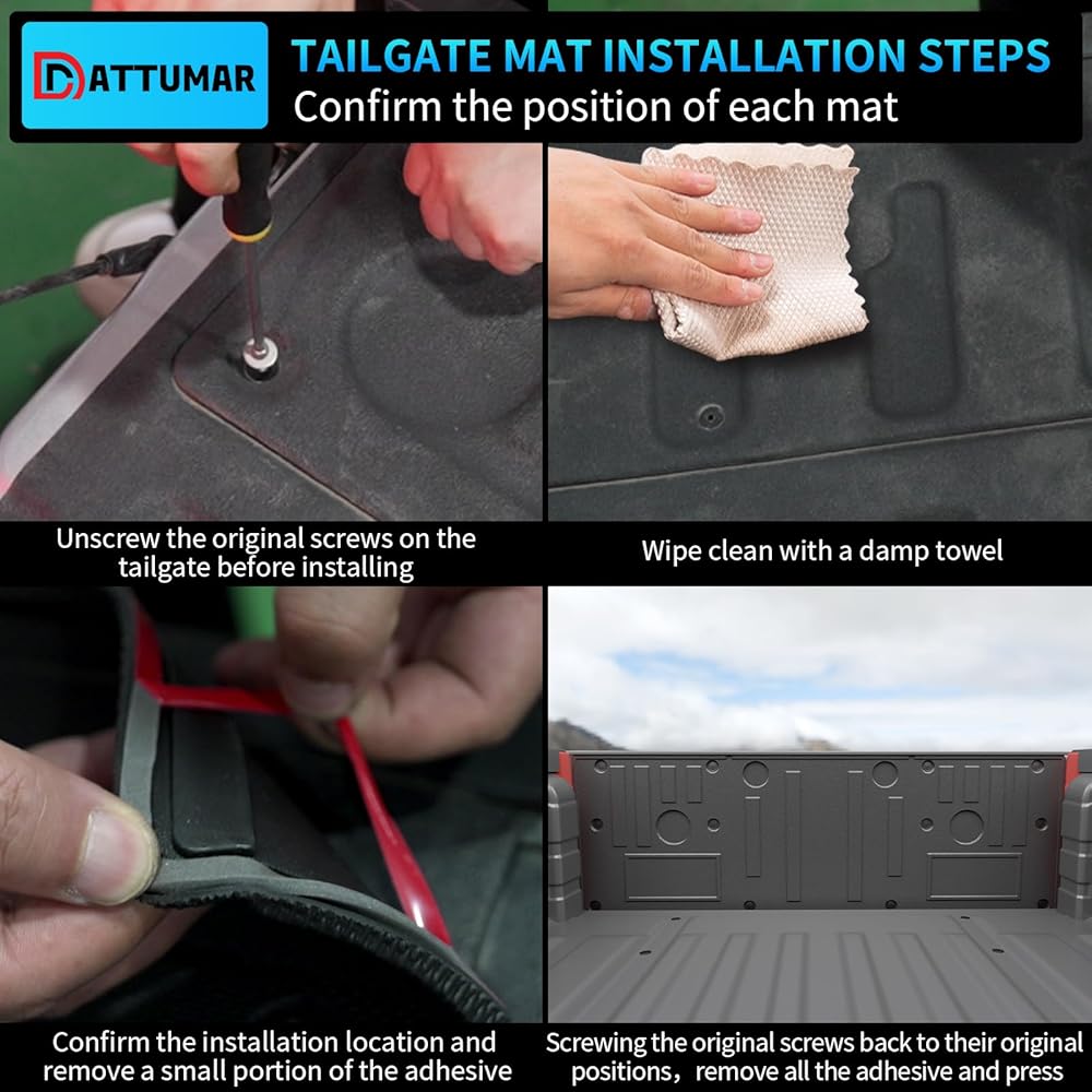 Tailgate mat installation steps: First, unscrew all the screws on the tailgate, and then wipe the tailgate with a towel. Then Tear off the adhesion promoter and apply it evenly at the installation location. Then tear off a small portion of the adhesive strips in the four corners, place the mat on the tailgate and align it. Install all the screws that have been unscrewed back, then tear off all the adhesive strips and press them a few times to complete the installation.