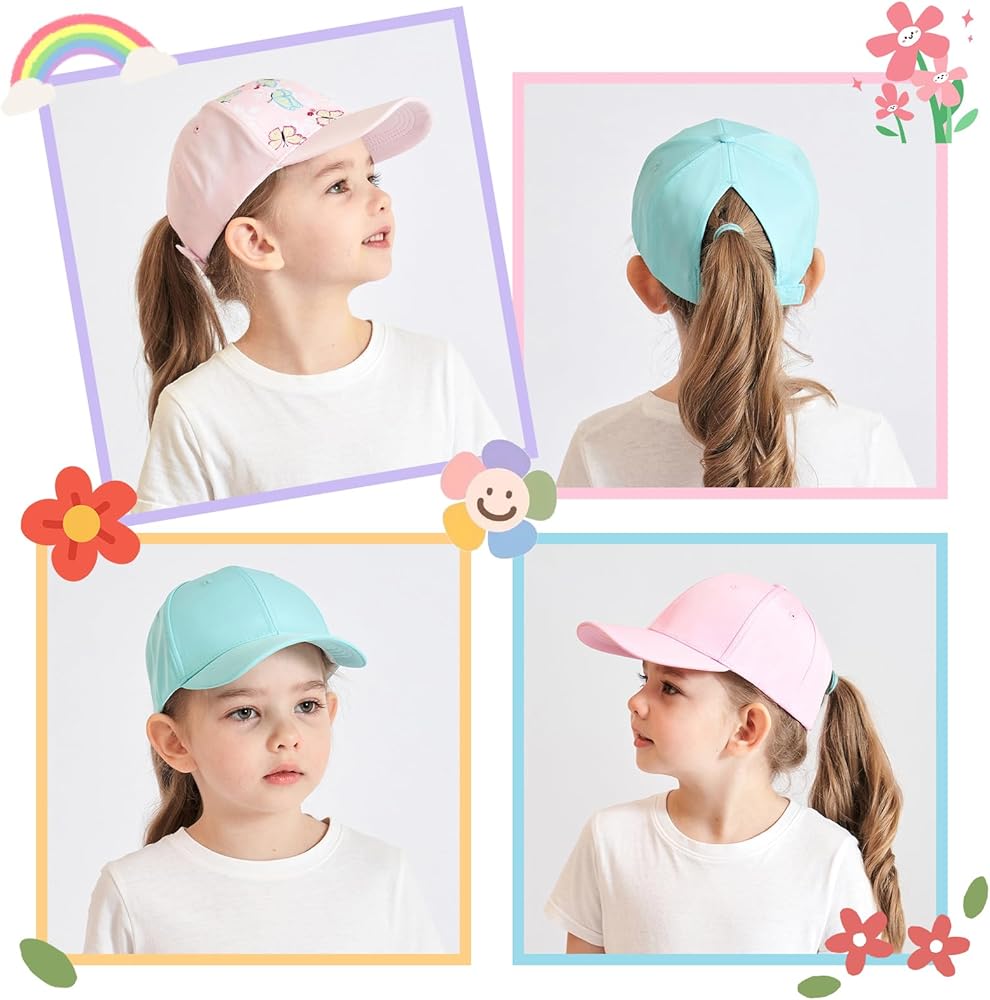 【Kids UV Protection Sun Hat】:The visor brim offers a wide shade for your forehead, face and eyes, thus protecting your skin from harmful rays, helps you stay cool as you enjoy your outdoor activities in the sun,The girls baseball hats come in a variety of patterns and solid colors, and the color is very eye-catching,Your kid will not want to take it off! Add some magic to your child's wardrobe with this adorable ponytail baseball cap!