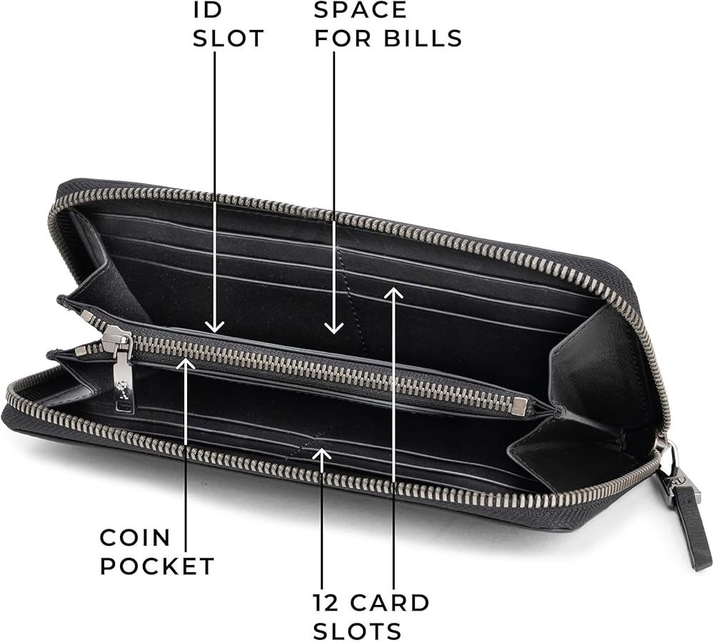 SLEEK & FUNCTIONAL. The Palma slim wallet blends style and functionality, offering 14 card slots, an ID window, two cash compartments, and a zippered coin pocket for organized storage. Lined with soft cotton and designed with a durable YKK zipper for durability. Dimensions: 7.9" x 3.7" x 1.2".