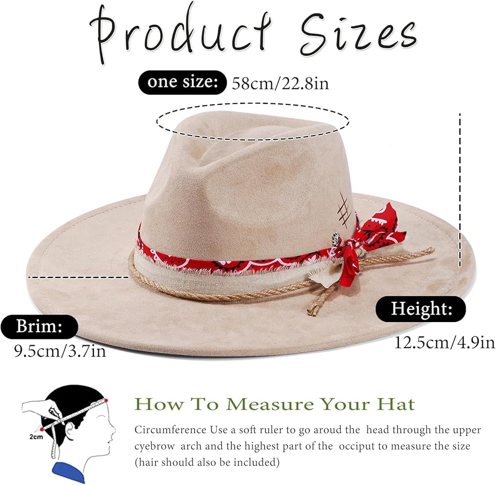 One size: the wide brim fedora hat is one size available, fits most ladies with a head circumference of 22-23 inches/56-58 cm, equivalent to US size M/L and head size: 7-7 3/8