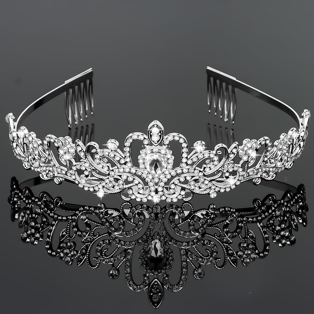Size & Usage: The silver crown is 6.9 inches in diameter, 2.55 inches in height and 5.11 inches in width. The veil is 31.49 inches long to better complement your flowing hair. The Queen's tiara has a metal comb at the end of each side to hold your hair without pulling it. It won't squeeze the shape of your head, even if you wear it all day.