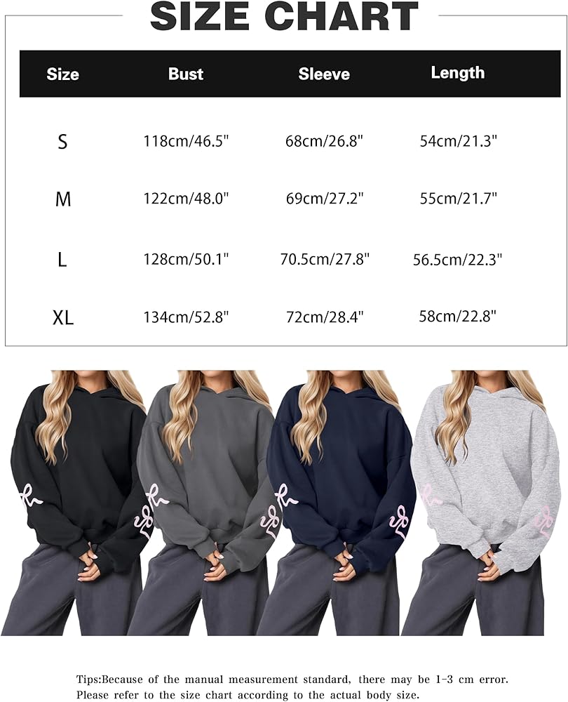 Style: The oversized fall hoodies is full of cuteness and casual style; preppy bow print on the sleeve make you stand out; also adds a touch of fashion and stay you warm and comforts with your favourite bottoms; matching jeans; cargo pants; sweatpants or others you like; fits any body shape and essential clothes in closets