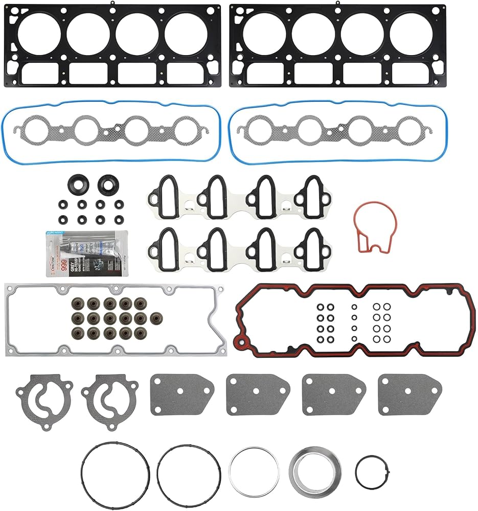 [PACKAGE INCLUDE] The engine gasket set includes: Exhaust Manifold Gasket x 2, MLS Head Gasket x 2, Valve Cover Gasket x 2, Other Small Seals x 7, Grommets x 20, Valve Oil Seals x 16, Intake Manifold Gasket x 2, RTV Silicone x 1, Oil Pan Gasket x 1, IntakeManifold Gasket x 1, Timing Cover Gaskets x 2, Cylinder Head Bolts x 30.