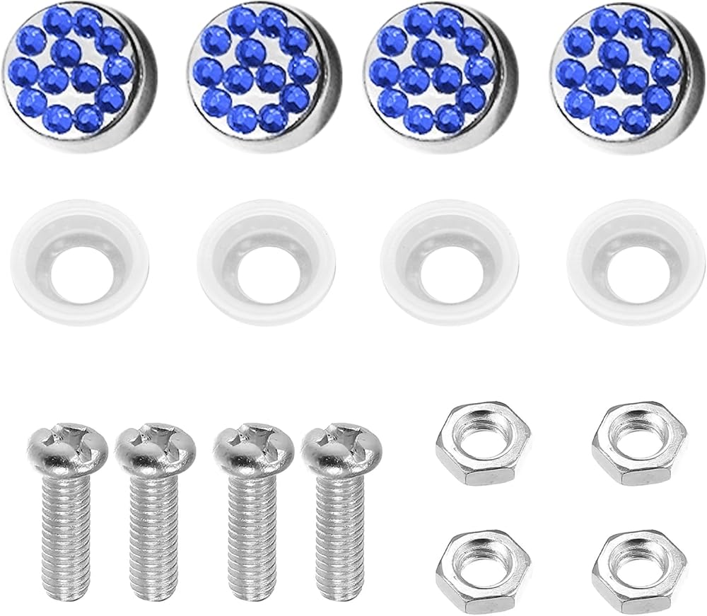 License Plate Screw Caps Stainless Steel Anti-Rattle Rustproof Rhinestone Diamond Fasteners 4PCS (Blue)