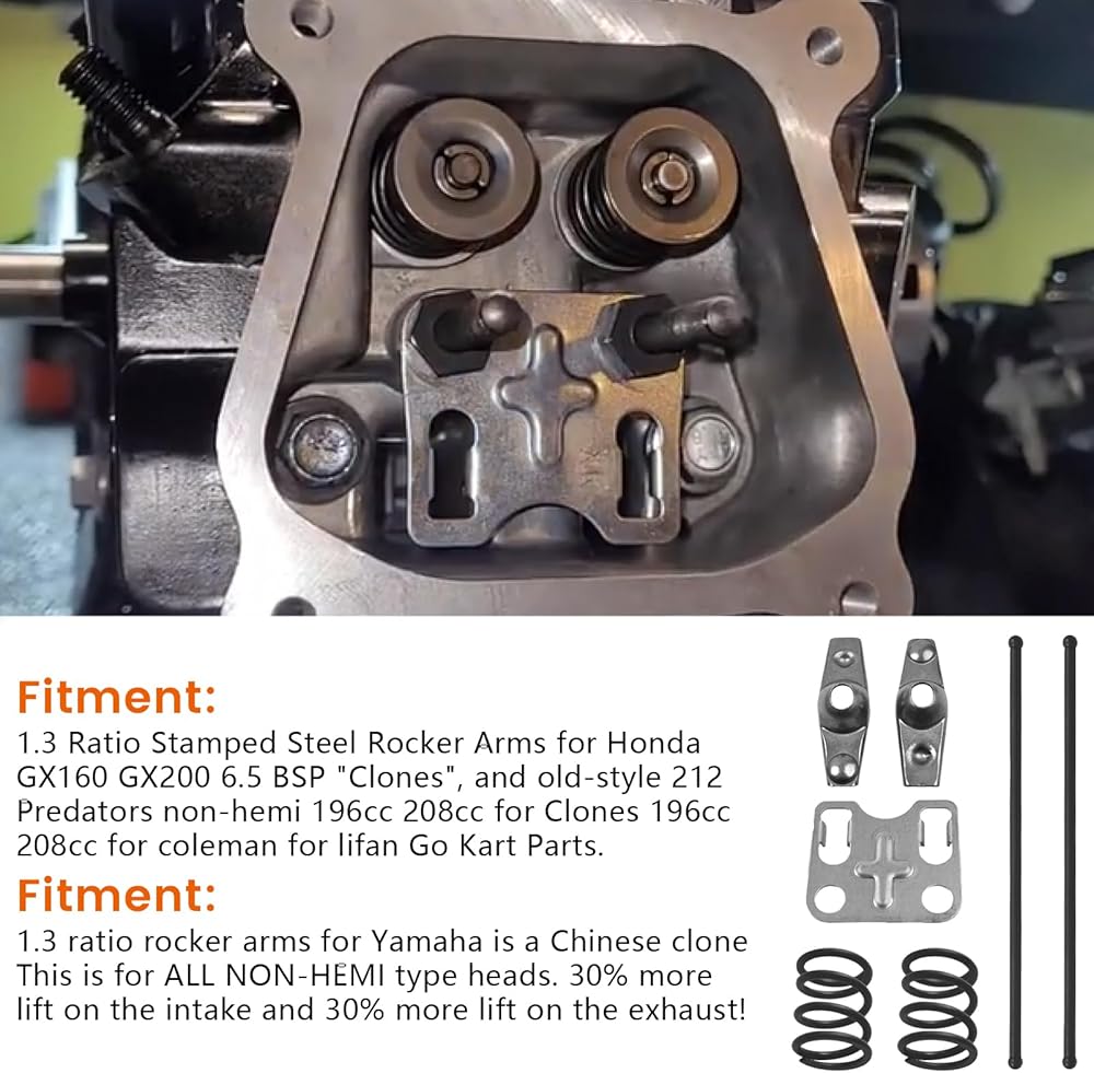 Fitment:1.3 Ratio Stamped Steel Rocker Arms for Honda GX160 GX200 6.5 BSP "Clones", and old-style 212 Predators non-hemi 196cc 208cc for Clones 196cc 208cc for coleman for lifan Go Kart Parts
