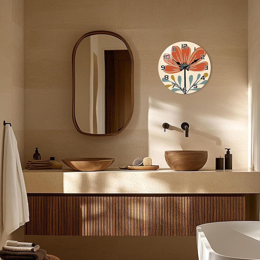 Material - Boho wall clock is made of MDF, HD pattern, waterproof, 10" frameless round analog wall clock, Coffee cup decorative wall clocks for bathroom. The clear and large clock face and black numbers, it is easier to read from long distance,whatever day or night.