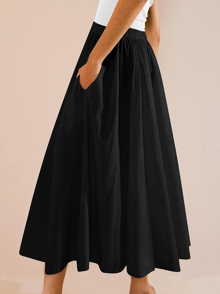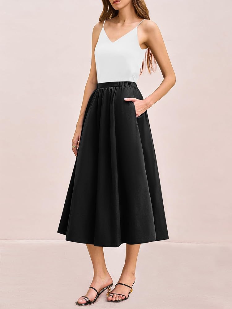 Design: This solid color midi-length skirts with pocket design is basic and versatile. The elastic waist feature provides a flattering fit for all body types. The A-Line design not only add a touch of fashion but also create a slimming effect on the legs.