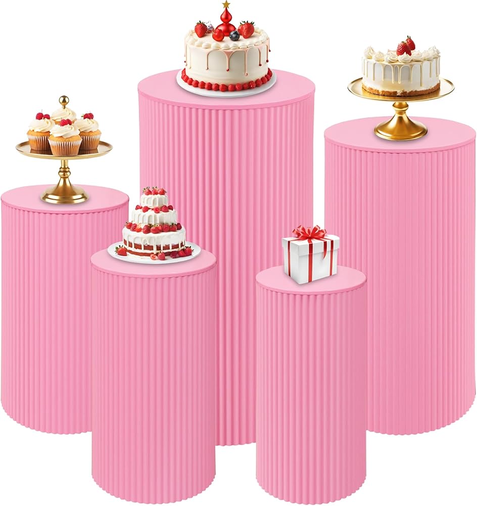 Package Includes: The set of 5 metal cylinder pedestal display stands are available in 5 different sizes, can meets your different display needs. Including 1 piece 35.63” H x 15.75” D, 1 piece 29.72” H x 14.17” D, 1 piece 23.82” H x 12.6” D, 1 piece 21.85” H x 11.02” D, and 1 piece 19.88” H x 9.45” D. Simply set up your cakes, desserts, and floral arrangements in a variety of heights and dimensions.
