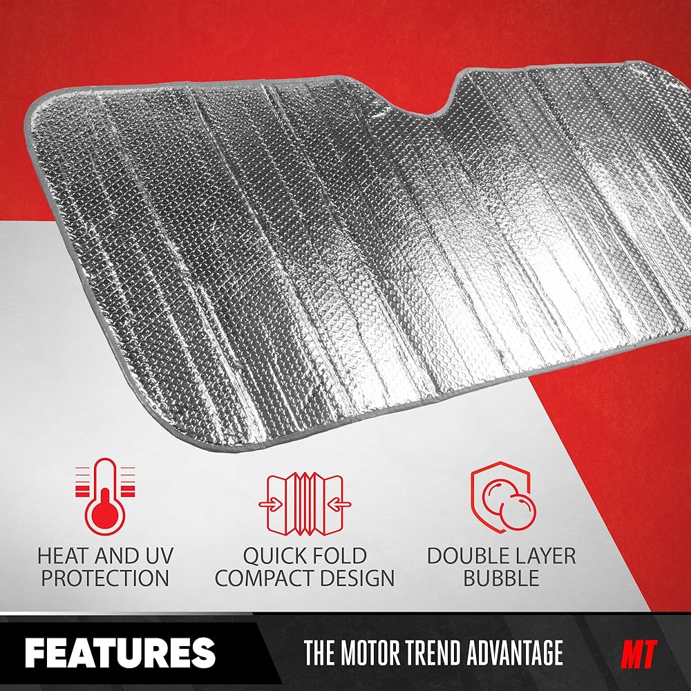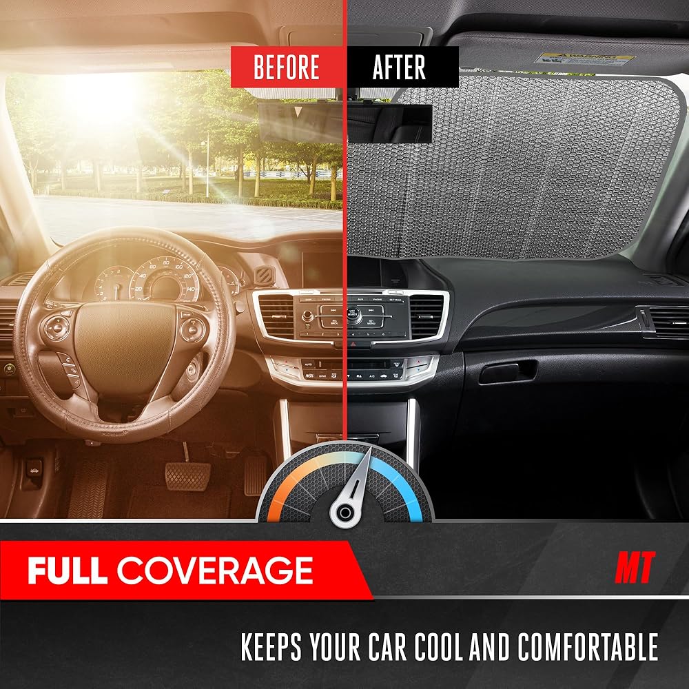 • QUICK & EASY SETUP / REVERSIBLE: The foldable accordion design makes setup a breeze, with convenient fold-away storage. This windshield shade is reversible, offering the same level of protection on both sides, making it perfect for cars and trucks while ensuring effortless use and storage.