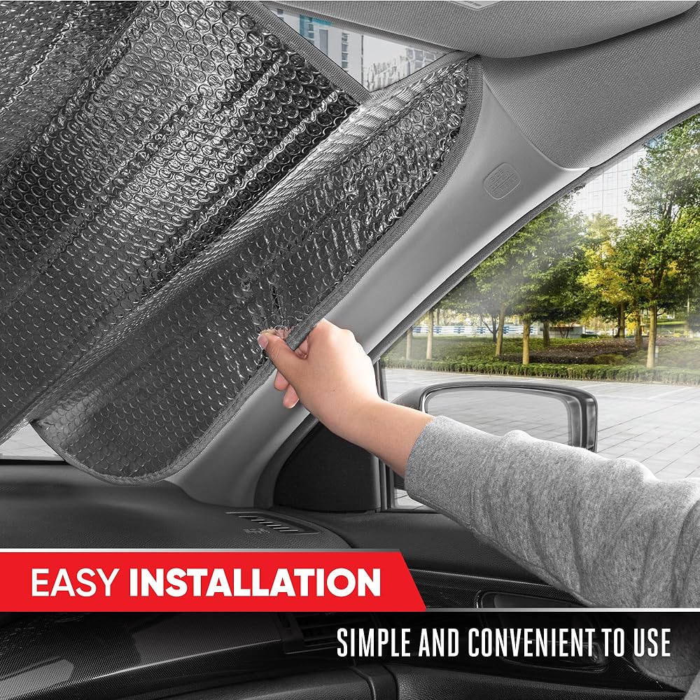 • 100% UV PROTECTION: This dual-layer bubble design windshield shades for car provides maximum protection for your car's interior. It effectively blocks the sun's heat and harmful UV rays, keeping your seats and steering wheel cool while safeguarding your vehicle's car windshield sun shadeterior from sun damage.