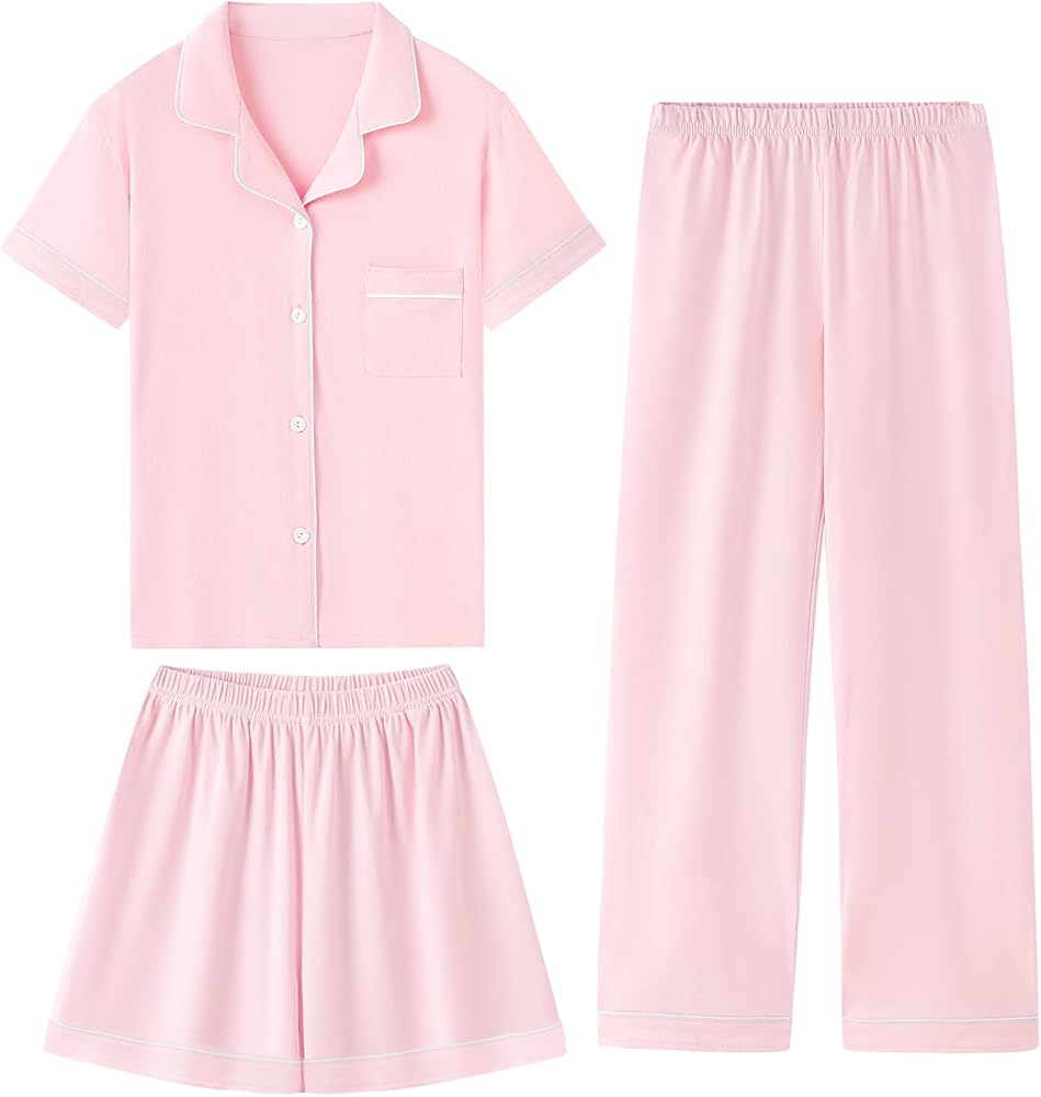 3 PCS Pajama Set : Girl's Cotton pajamas set comes with comfy short sleeve pajamas shirt, Cotton shorts, a pair of drawstring elastic waist long pants, you can match this sleepwear in differnt way to meet your needs all year around