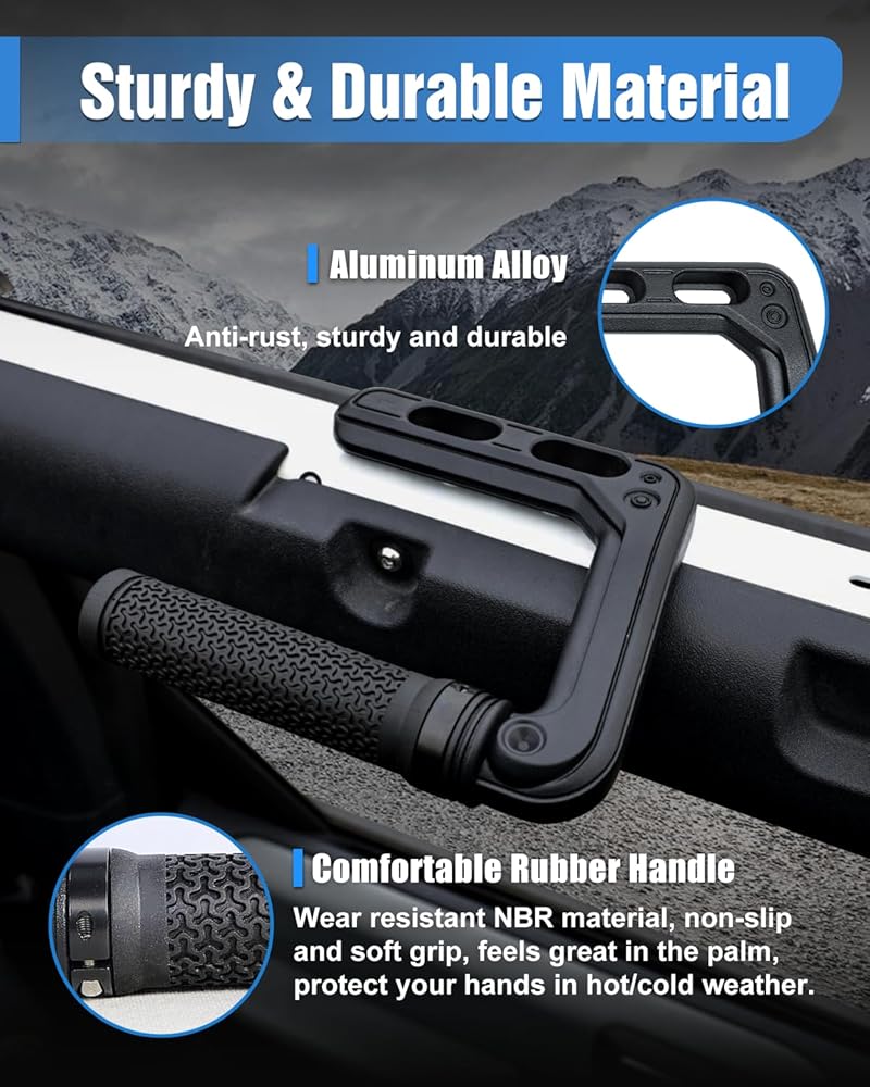 【STURDY & DURABLE】New Bronco grab handle is made of aluminum with upgraded anti-slip rubber, with oxidized frosted smooth surface, strong, corrosion-resistant, anti-slip, providing more comfortable and stable hand support.