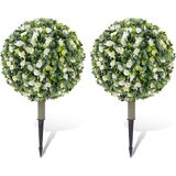 Set of 2 Artificial Christmas Boxwood Topiary Ball Shrubs, 20" UV-Resistant Faux Outdoor Plants with Ground Spikes — Realistic Purple and Green Decorative Bushes for Porch, Patio, Garden, Yard Décor