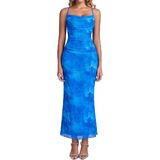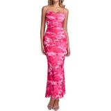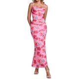 Features: spring floral maxi dress for women with vintage print design, ruched, high waist, tight fit, adjustable spaghetti straps, mesh bodycon dress women