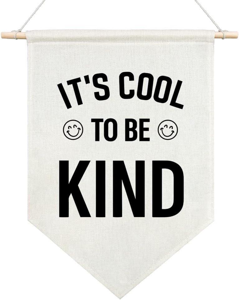 It's Cool to Be Kind Canvas Hanging Pennant Flag, Farmhouse Porch Home School Classroom Kids Room Playroom Bedroom Decor, Empowerment Gifts for Family Friend Classmate BFF