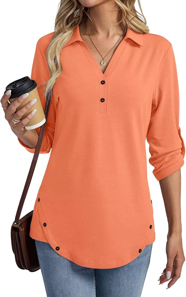 Features: 3/4 Sleeve Tops, V Neck T Shirts, Collared Shirts, Henley Tunic Tops, Rolled Sleeve Tops, Both Side Buttons Blouse, Solid Color, Classic, Basic and Casual; Irregular side hemline with button designs, and front enough length, nice coverage ornament the belly and bottom area, make you more glamorous and elegant