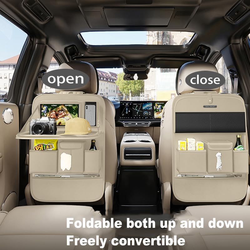 GMQ Back Seat Car Organizer 1 Pack,Backseat Organizer with Tray,Multifunctional Car Seat Back Storage Box with Foldable Tablet Holder (Beige, Plain weave)