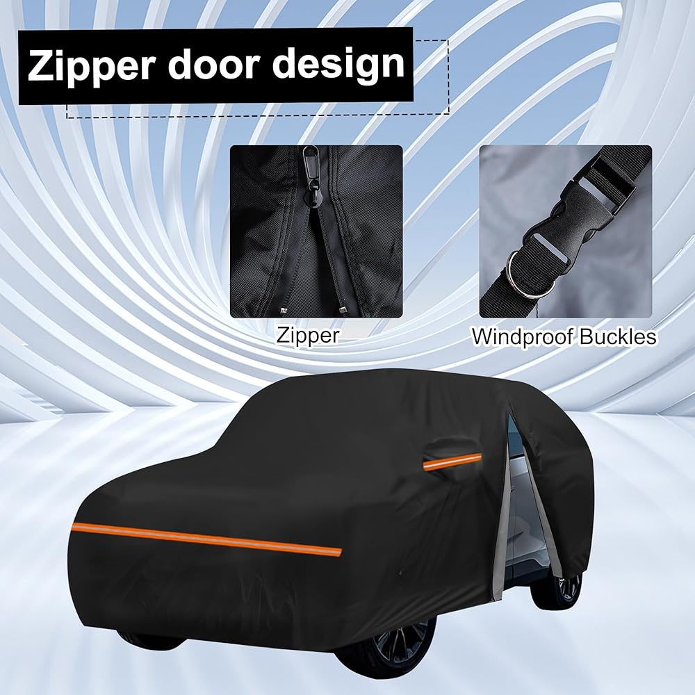 Zipper Access & Elastic Hem: Features convenient zipper openings on driver door side for easy access, plus an elastic hem for quick installation and removal, ensuring a tight fit.
