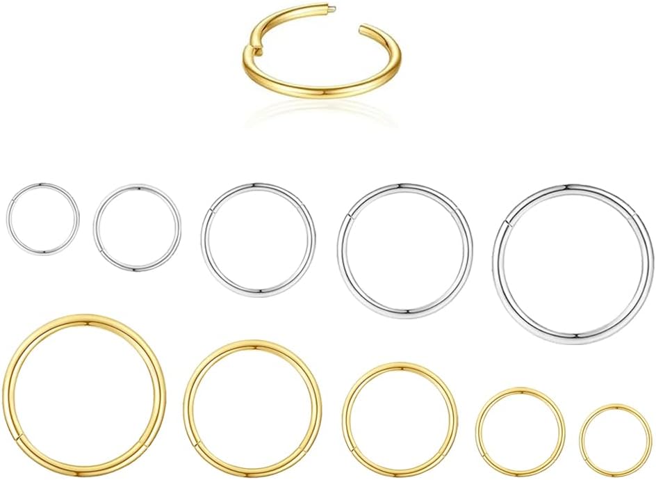✦SIZE: One Order With 5 Pairs(10Pcs) Seamless Earring Hoop Piercing With Different Sizes, Pin Gauge size:18 Gauge (1.0mm), Inner Diameter 6mm,8mm,10mm,12mm,14mm.Color:Silver.Suitable Size for body piercings like nostril ,forward helix, helix, cartilage, tragus, anti-tragus, rook, snug, daith, second or third lobe , auricle piercings and lip nipple rings , etc other body piercing.