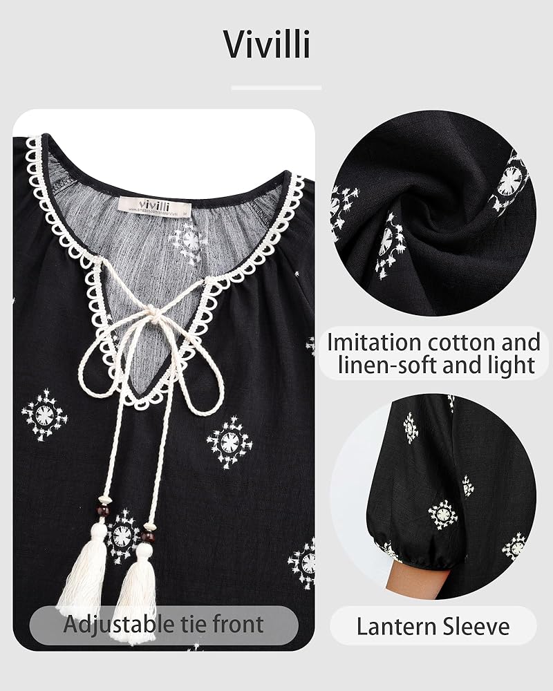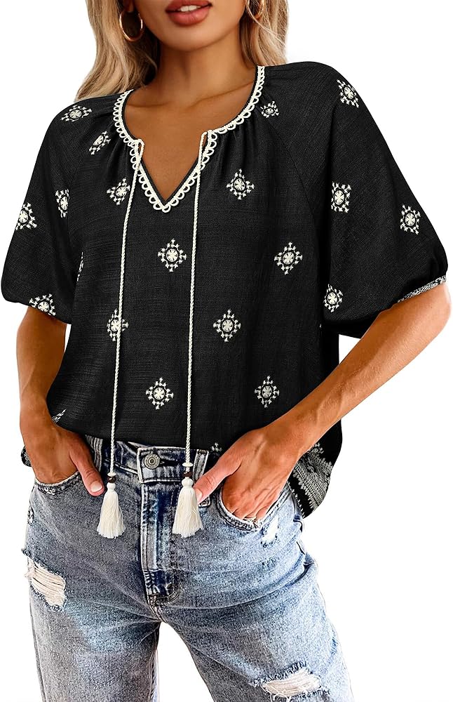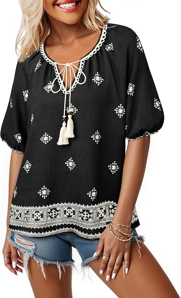 Exquisite Boho Design: Timeless Free-Spirit Aesthetic - Summer tops for women have Relaxed Silhouette: Puff lantern short sleeves + flowy hem, hand-embroidered smocked collars, adjustable bow tie front necklines, loose fit, floral printed hem for effortless bohemian charm. Boho shirts tops flattering all body types. Very suitable for hot summer. Pretty boho clothes for women, beach vacation clothes for women, resort wear for women 2025!