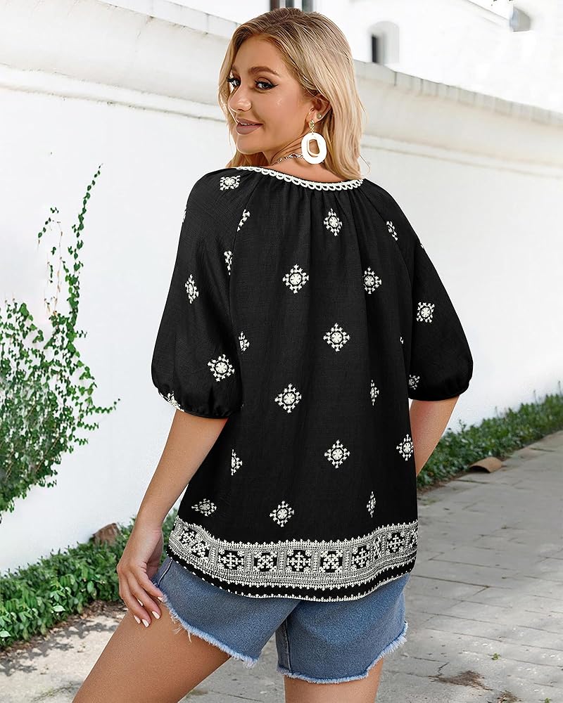 Effortless Mix-and-Match Hacks - Womens short sleeve bohemian blouses can paired with Bottoms: French-tuck into high-waisted jeans, pair with leather skirts, or layer over leggings. Accessories: Elevate with layered necklaces + floppy hats or minimalist cuffs + heeled boots. Seasons: Transition from tropical vacations (solo) to snowy days (under coats) seamlessly.