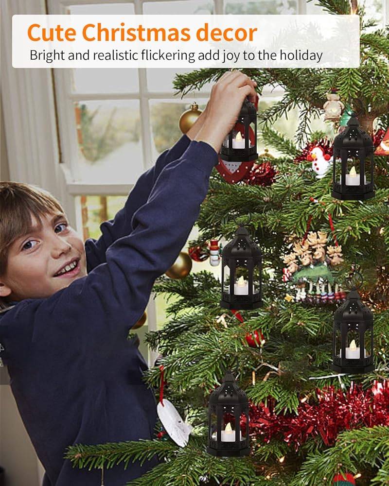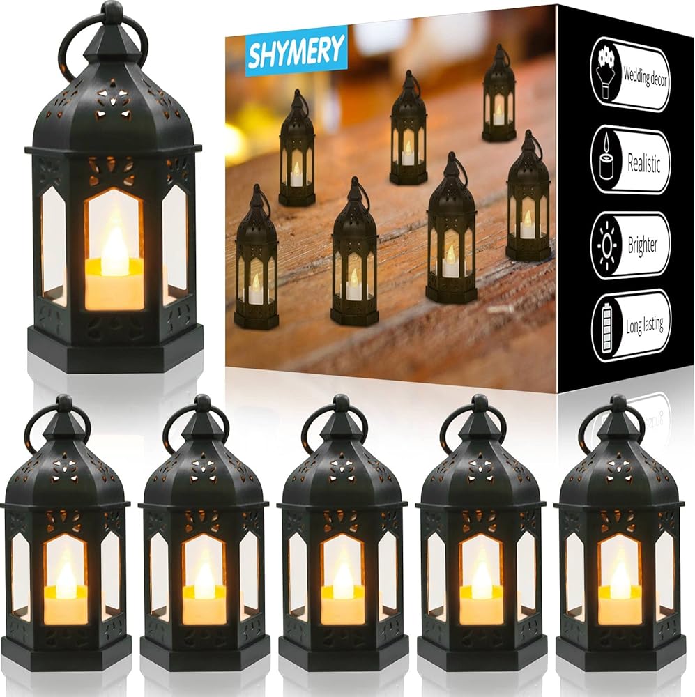 SHYMERY Mini Lantern with Flickering LED Candles,Vintage Black Decorative Hanging Candle Lanterns for Halloween,Wedding Decorations,Christmas,Table Centerpiece,Battery Included(Set of 6)