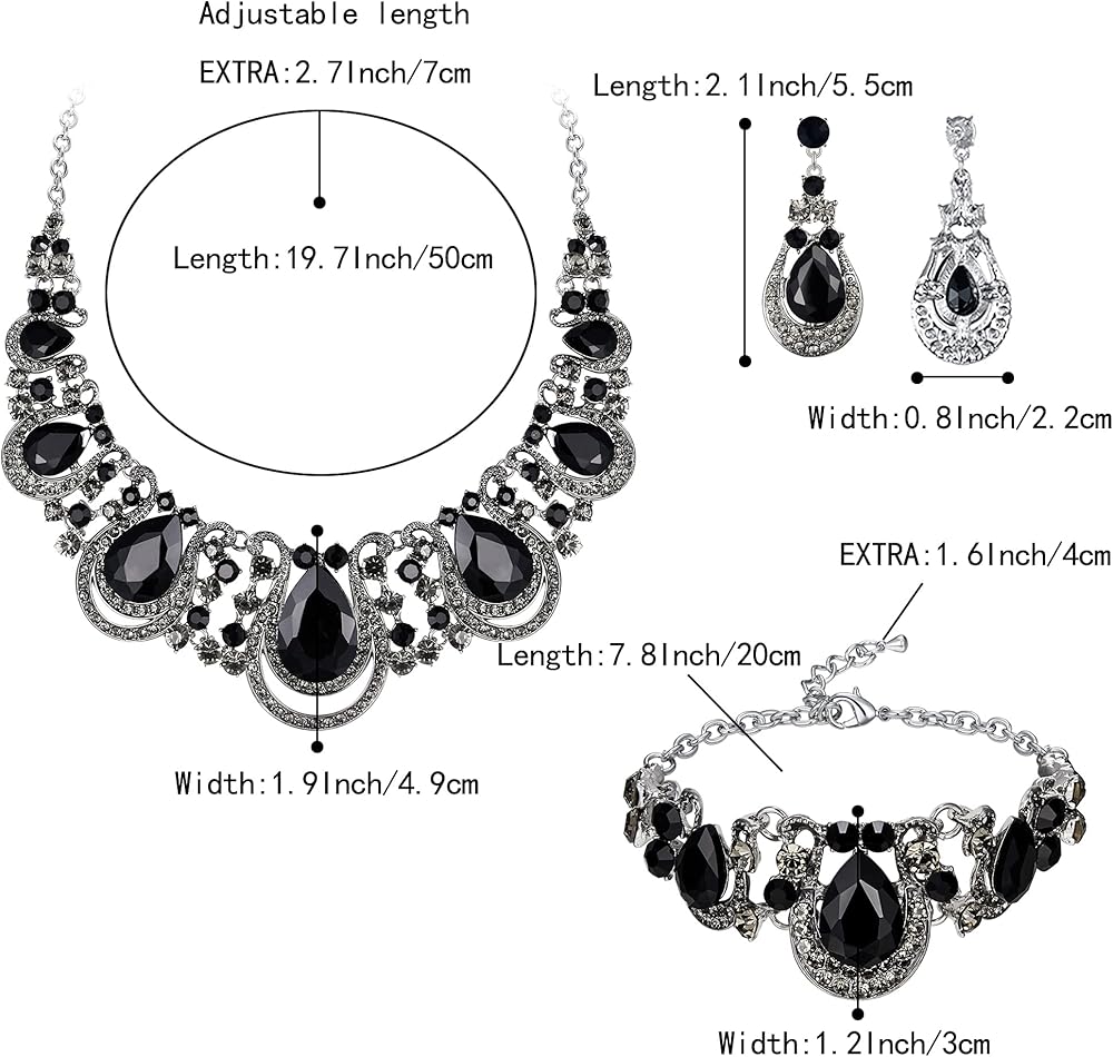 Specifications and Size: Necklace: Pendant Width:1.9in, Chain Length (Adjustable): 19.7-22.4in; Bracelet: Width: 1.2inch, Chain Length (Adjustable): 7.8-9.4inch; Earrings Size: 2.1*0.8in. Each Earring Weight: 8.8g.Total Weight: 151g.