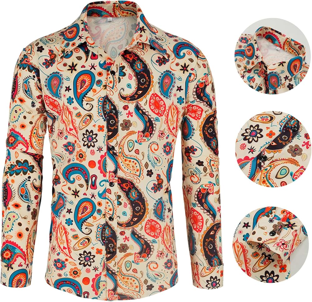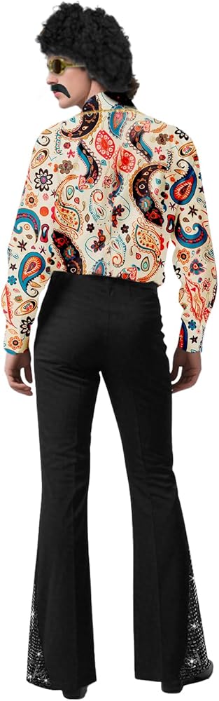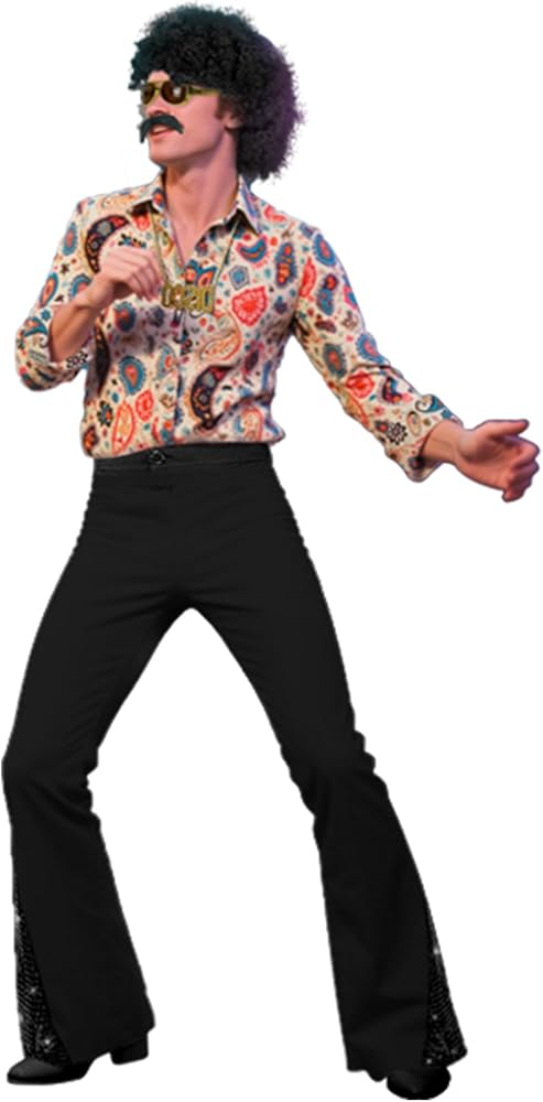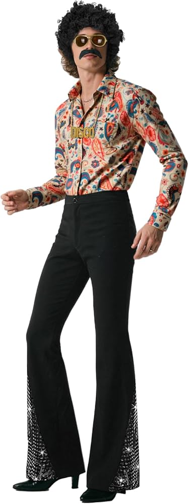 These men disco costumes and accessories can well match together and get you quickly into the disco party atmosphere; The pant hem of the mens bell bottom pants is designed with the sequins while the shirt has the retro pattern design; The gold disco necklace, glasses and curly cosplay wig can add more details for your dress