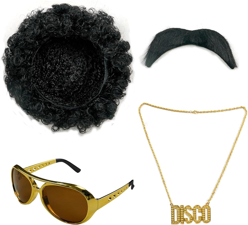 You will receive 1 piece of disco shiny shirt, 1 pair of sequin bell bottom pants, 1 piece of men wig, 1 pair of sunglasses, 1 piece of necklace and fake beard