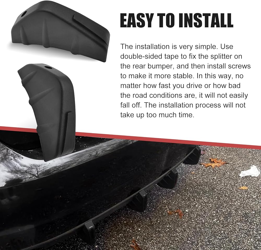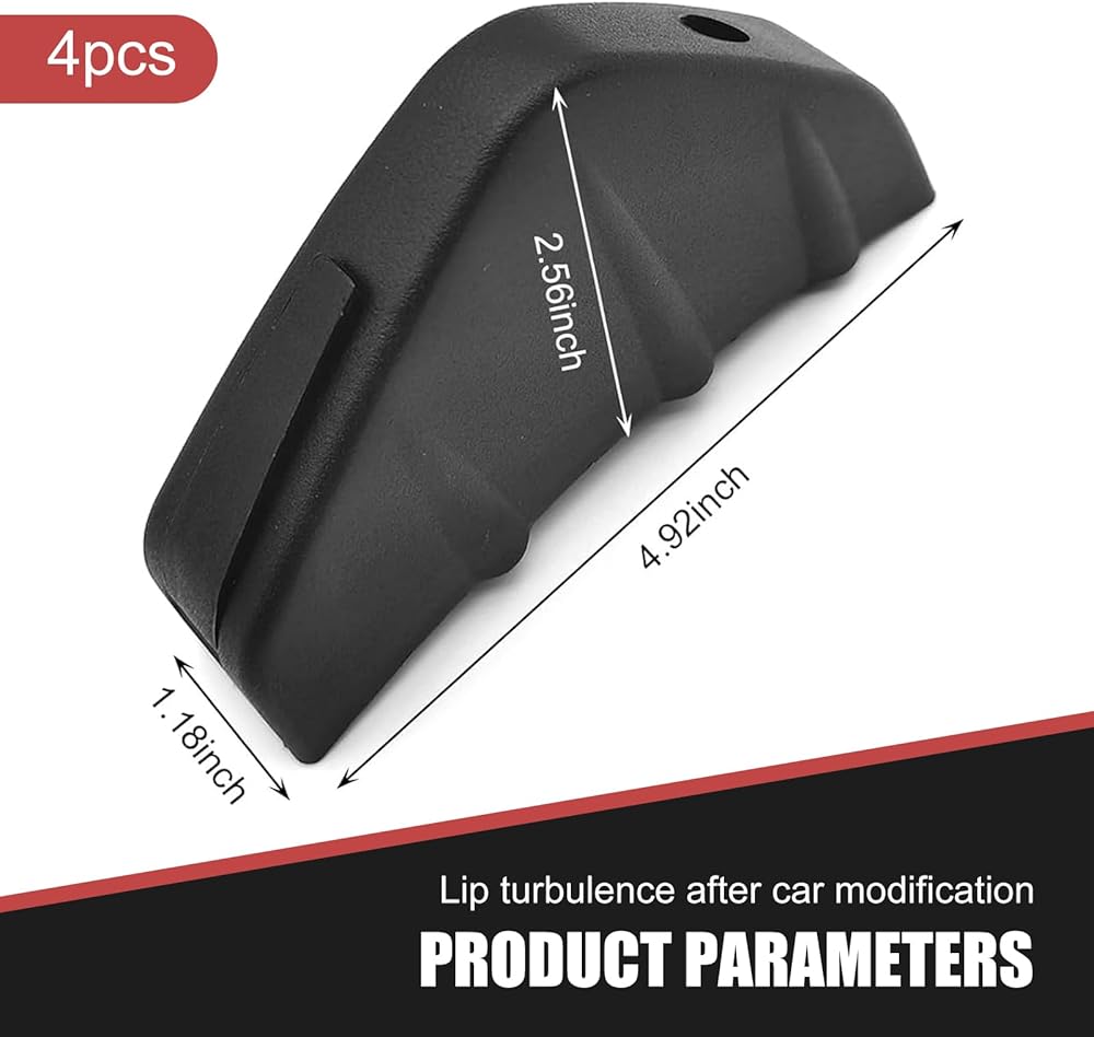 What You Will Get: The package includes 4 rear lower bumper spoiler accessories, with an overall size of 4.92" x 2.55", and the side thickness is 1.18" and 0.98" respectively. The overall workmanship is exquisite, smooth and delicate, and the texture is advanced.