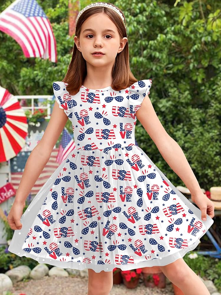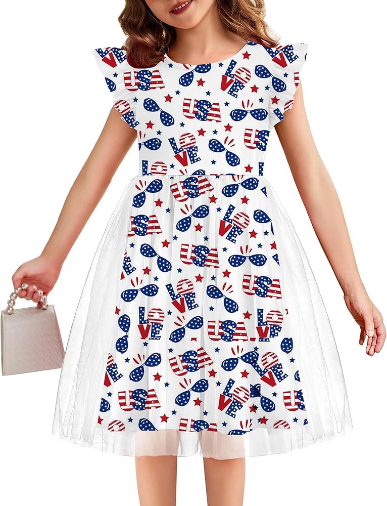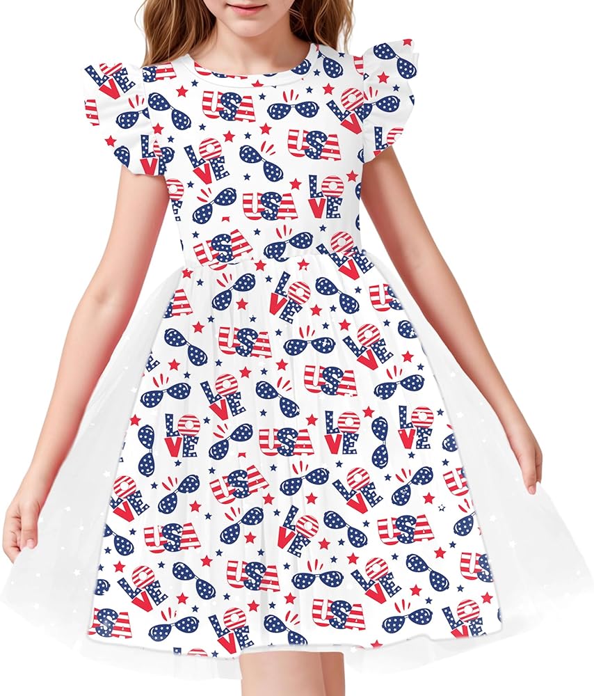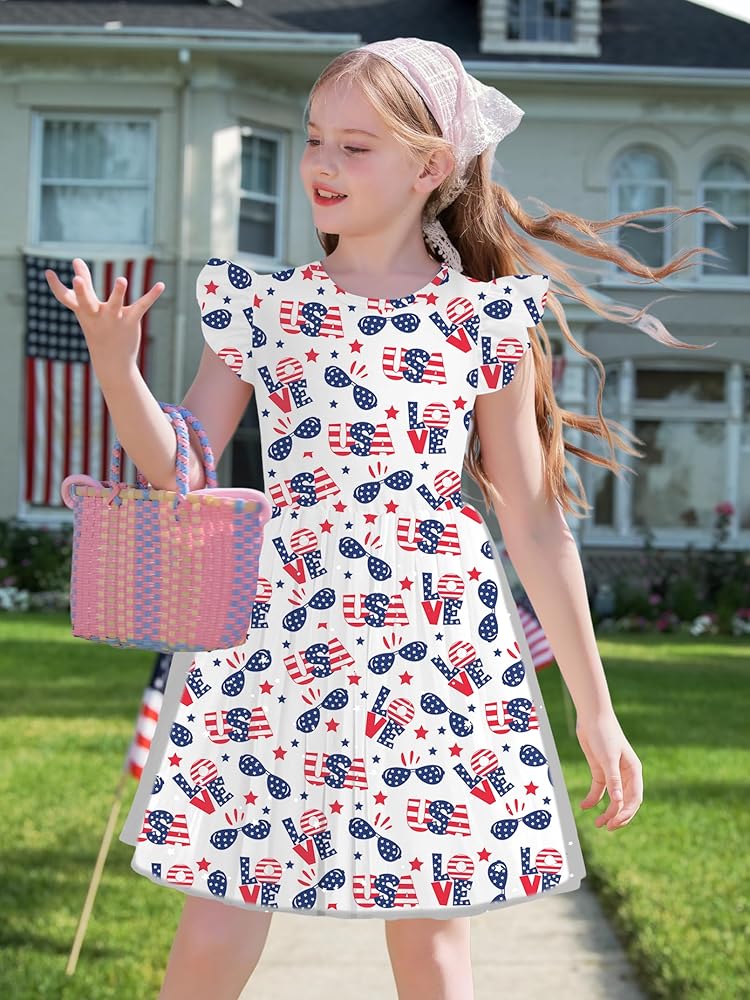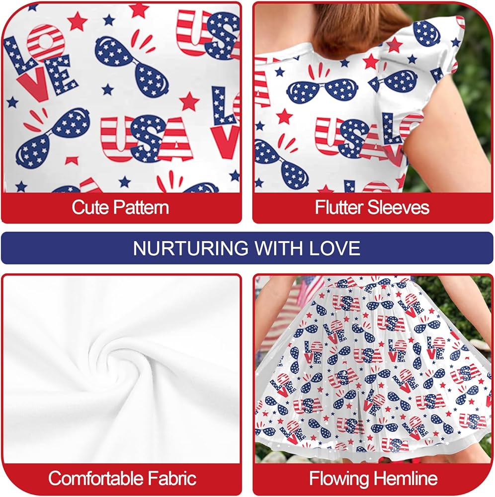 Style and design: Patriatic dress printed including USA letters love design american flag red white and blue ,the dress features a round neckline and flutter sleeves. Its unique and fashionable design will make you the most eye-catching princess wherever you go.