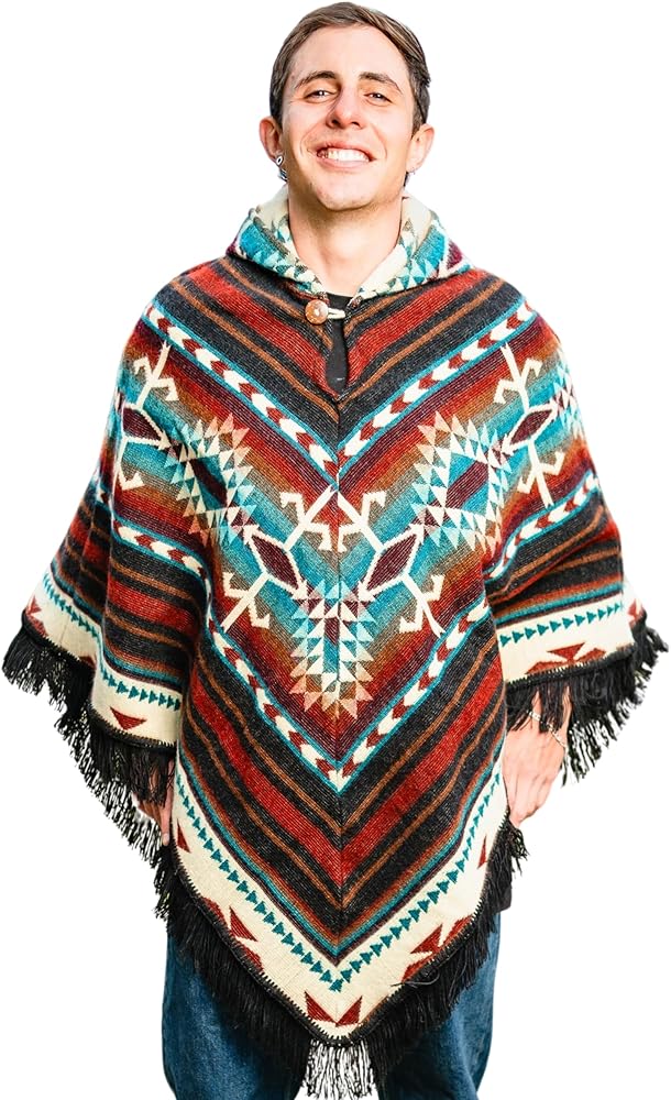 【 HANDMADE IN ECUADOR 】 Alpaca Mens Poncho with Hood tejido a mano en Otavalo, apoya a artesanos de comercio justo y refleja herencia andina auténtica.